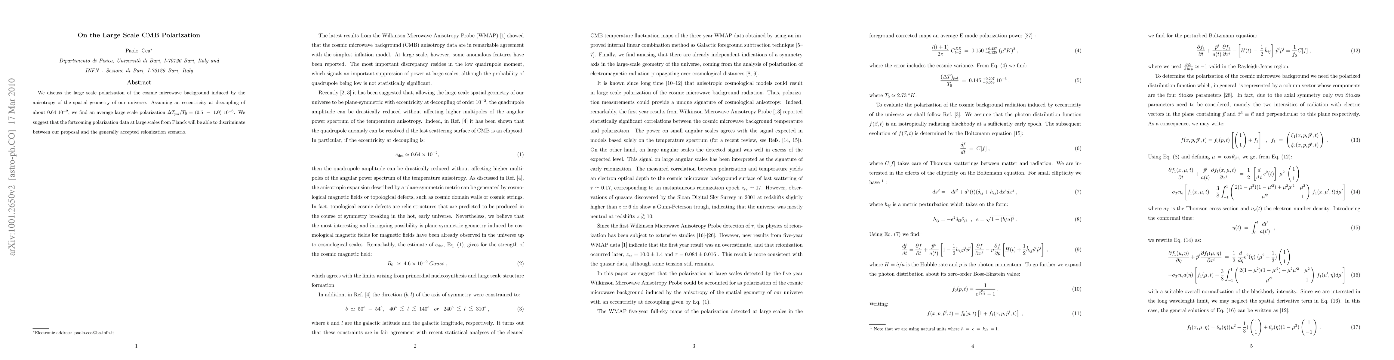 We discuss the large scale polarization of the cosmic microwave background induced by the anisotropy of the spatial geometry of our universe. Assuming an eccentricity at decoupling of about $0.64 10^{-2}$, we find an average large scale polarization $\Delta T_{pol}/ T_0 = (0.5 - 1.0) 10^{-6}$. We suggest that the fortcoming polarization data at large scales from Planck will be able to discriminate between our proposal and the generally accepted reionization scenario.