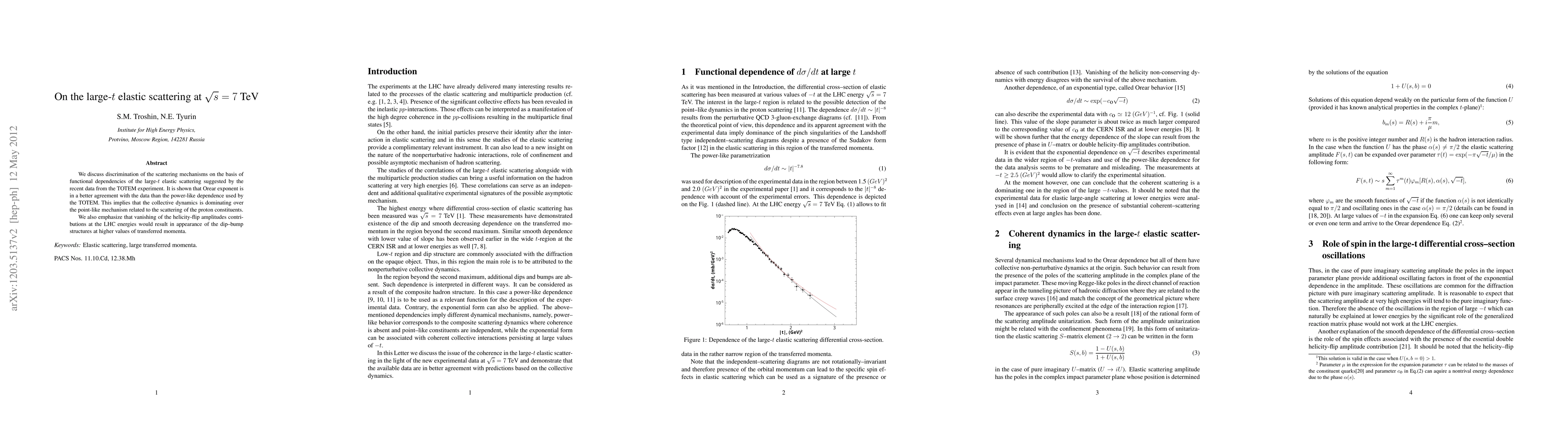 Summary: The paper examines large-$t$ elastic scattering at $\sqrt{s}=7$ TeV, finding that the Orear exponent better fits recent TOTEM data compared to the TOTEM-used power-law model, suggesting collective dynamics dominate over point-like proton constituent interactions.