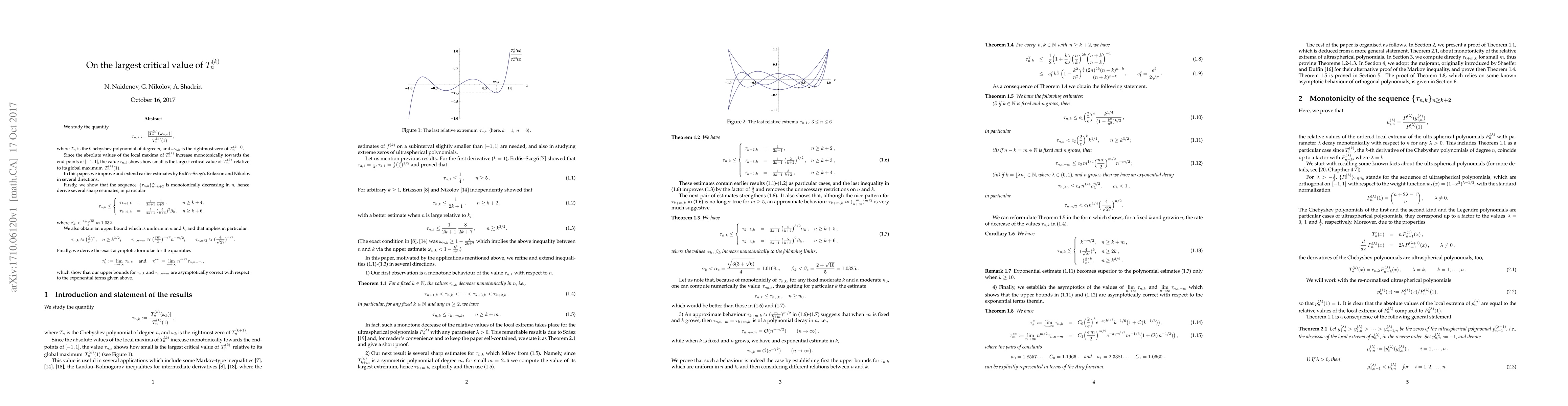 We study the quantity $$ \tau_{n,k}:=\frac{|T_n^{(k)}(\omega_{n,k})|}{T_n^{(k)}(1)}\,, $$ where $T_n$ is the Chebyshev polynomial of degree $n$, and $\omega_{n,k}$ is the rightmost zero of $T_n^{(k+1)}$. Since the absolute values of the local maxima of $T_n^{(k)}$ increase monotonically towards the end-points of $[-1,1]$, the value $\tau_{n,k}$ shows how small is the largest critical value of $\,T_n^{(k)}\,$ relative to its global maximum $\,T_n^{(k)}(1)$. In this paper, we improve and extend earlier estimates by Erd\H{o}s--Szeg\H{o}, Eriksson and Nikolov in several directions. Firstly, we show that the sequence $\,\{\tau_{n,k}\}_{n=k+2}^{\infty}$ is monotonically decreasing in $n$, hence derive several sharp estimates, in particular $$ \tau_{n,k} \le \begin{cases} \tau_{k+4,k} = \frac{1}{2k+1}\,\frac{3}{k+3}\,, & n \ge k+4\, \tau_{k+6,k} = \frac{1}{2k+1}\, (\frac{5}{k+5})^2 \beta_k\,, & n \ge k+6\,, \end{cases} $$ where $\beta_k < \frac{2+\sqrt{10}}{5} \approx 1.032$. We also obtain an upper bound which is uniform in $n$ and $k$, and that implies in particular $$ \tau_{n,k} \approx \big(\frac{2}{e}\big)^k, \quad n \ge k^{3/2}; \qquad \tau_{n,n-m} \approx \big(\frac{em}{2}\big)^{m/2} n^{-m/2}; \qquad \tau_{n,n/2} \approx \big(\frac{4}{\sqrt{27}}\big)^{n/2}. $$ Finally, we derive the exact asymptotic formulae for the quantities $$ \tau_k^{*} := \lim_{n\to\infty}\tau_{n,k} \quad \mbox{ and }\quad \tau_m^{**} := \lim_{n\to\infty} n^{m/2} \tau_{n,n-m}\,, $$ which show that our upper bounds for $\tau_{n,k}$ and $\tau_{n,n-m}$ are asymptotically correct with respect to the exponential terms given above.