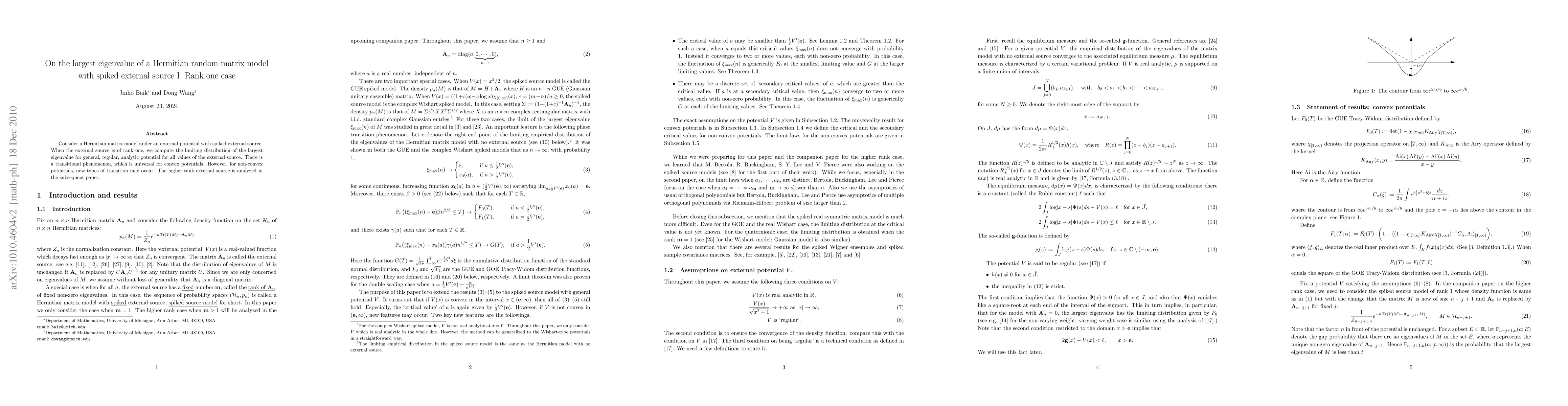 This paper investigates the largest eigenvalue of a Hermitian random matrix model with a spiked rank one external source, determining its limiting distribution for general analytic potentials. It reveals a universal transitional phenomenon for convex potentials, while non-convex potentials may exhibit different types of transitions. Higher rank sources are analyzed in a follow-up study.