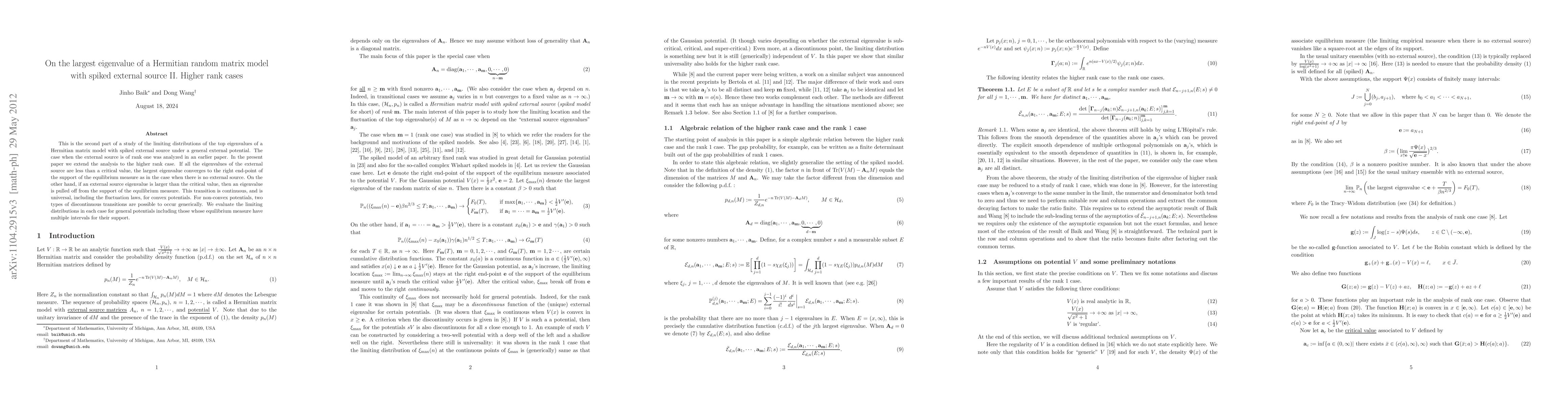 This paper extends the study of the largest eigenvalue of a Hermitian random matrix with a spiked external source, focusing on higher rank cases. It finds that the largest eigenvalue converges to the right end-point of the support of the equilibrium measure when all external source eigenvalues are below a critical value, while larger eigenvalues cause a shift away from this support, with universal transition behaviors for convex potentials and possible discontinuous transitions for non-convex potentials.