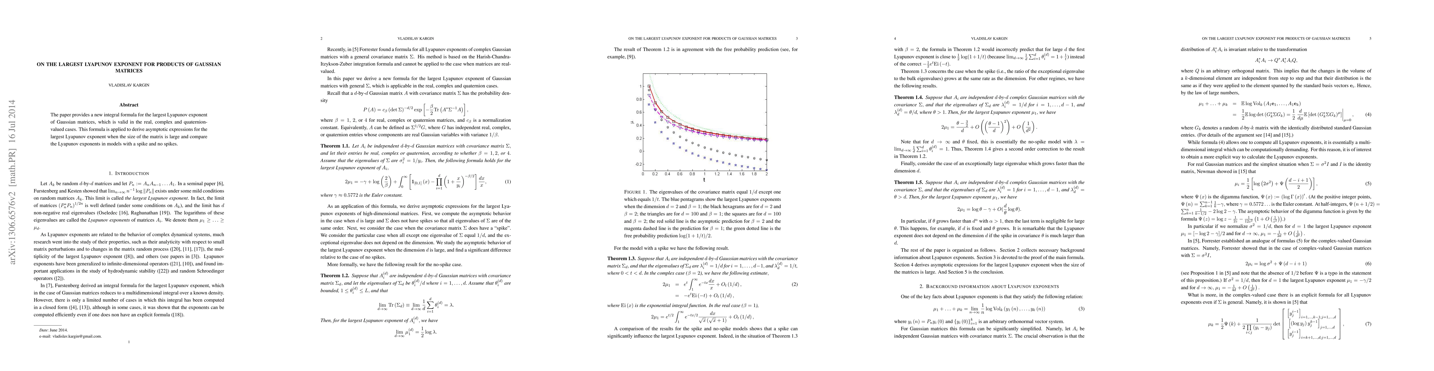 The paper introduces a new integral formula for the largest Lyapunov exponent of Gaussian matrices, applicable across real, complex, and quaternion-valued cases, and uses it to derive asymptotic expressions for large matrices and compare exponents in spiked and non-spiked models.