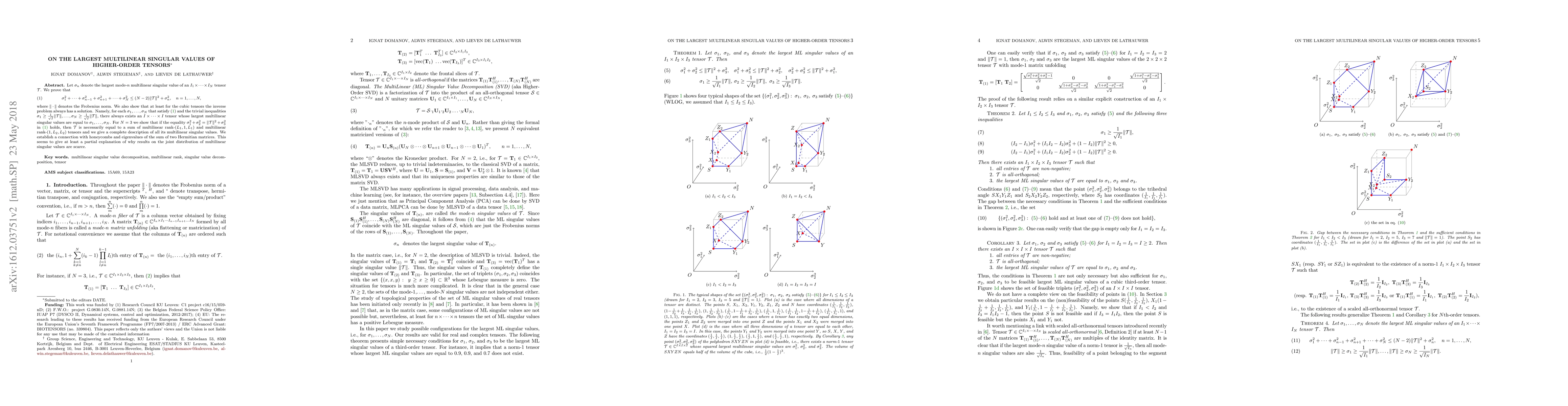 This paper investigates the largest multilinear singular values of higher-order tensors, proving an inequality that relates these values and the Frobenius norm. It demonstrates that for cubic tensors, an inverse problem always has a solution, and it provides a complete description for the case of cubic tensors satisfying a specific equality, linking it to multilinear rank tensors and honeycomb structures.