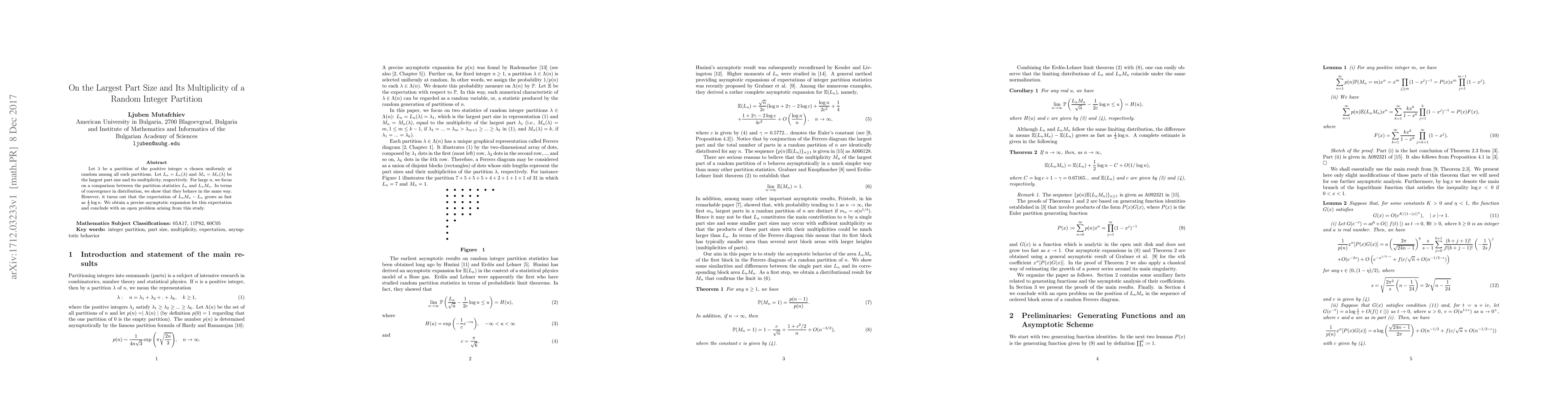 This research investigates the largest part size $L_n$ and its multiplicity $M_n$ in random integer partitions, demonstrating that their distributional behaviors converge similarly for large $n$. It also reveals that the expectation of $L_n M_n - L_n$ grows asymptotically as $\frac{1}{2}\log{n}$, providing a precise asymptotic expansion for this growth.