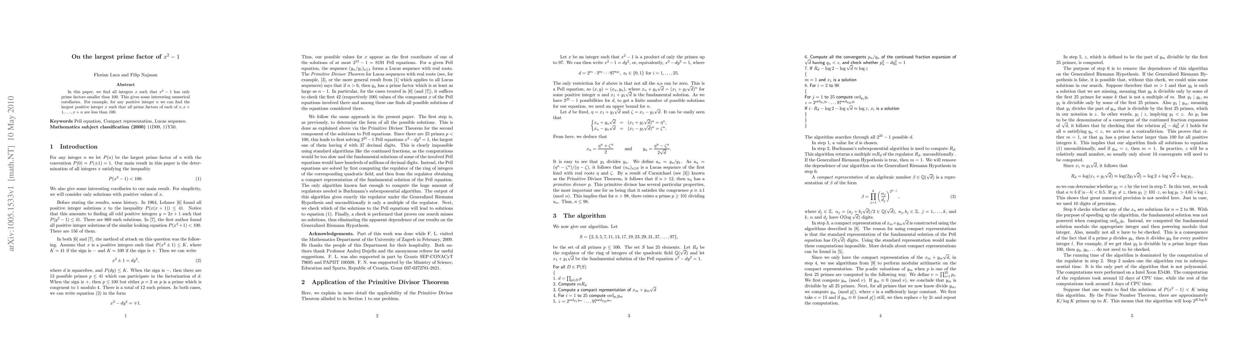 The paper finds integers x such that x^2-1 has only prime factors smaller than 100, with implications for finding largest positive integers in a range with prime factor limitations.