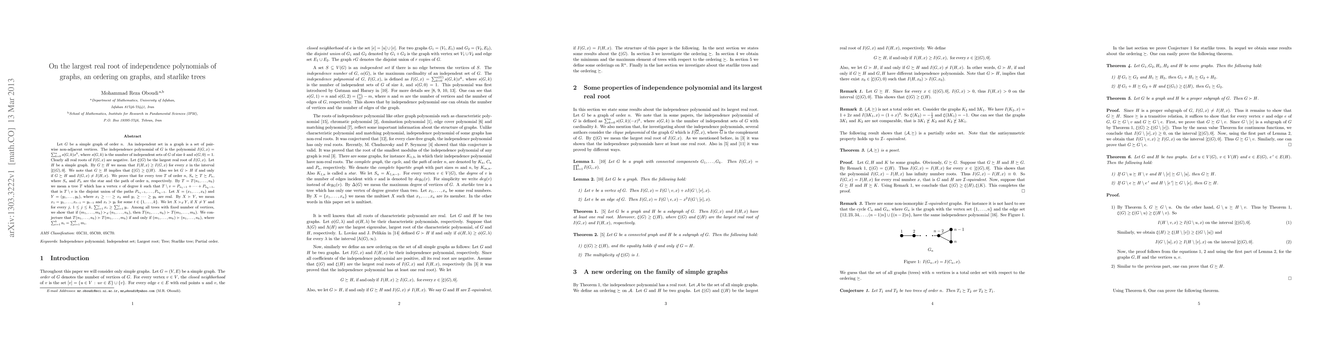 Let $G$ be a simple graph of order $n$. An independent set in a graph is a set of pairwise non-adjacent vertices. The independence polynomial of $G$ is the polynomial $I(G,x)=\sum_{k=0}^{n} s(G,k) x^{k}$, where $s(G,k)$ is the number of independent sets of $G$ of size $k$ and $s(G,0)=1$. Clearly all real roots of $I(G,x)$ are negative. Let $\xi(G)$ be the largest real root of $I(G,x)$. Let $H$ be a simple graph. By $G \succeq H$ we mean that $I(H,x)\geq I(G,x)$ for every $x$ in the interval $[\xi(G),0]$. We note that $G\succeq H$ implies that $\xi(G)\geq \xi(H)$. Also we let $G\succ H$ if and only if $G\succeq H$ and $I(G,x)\neq I(H,x)$. We prove that for every tree $T$ of order $n$, $S_n\succeq T\succeq P_n$, where $S_n$ and $P_n$ are the star and the path of order n, respectively. By $T=T(n_1,\ldots,n_k)$ we mean a tree $T$ which has a vertex $v$ of degree $k$ such that $T\setminus v=P_{n_1-1}+\cdots+P_{n_k-1}$, that is $T\setminus v$ is the disjoint union of the paths $P_{n_1-1},\ldots,P_{n_k-1}$. Let $X=(x_1,\ldots,x_k)$ and $Y=(y_1,\ldots,y_k)$, where $x_1\geq \cdots\geq x_k$ and $y_1\geq\cdots\geq y_k$ are real. By $X\succ Y$, we mean $x_1=y_1,\ldots,x_{t-1}=y_{t-1}$ and $x_t>y_t$ for some $t\in\{1,\ldots,k\}$. We let $X\succ_{d}Y$, if $X\neq Y$ and for every $j$, $1\leq j\leq k$, $\sum_{i=1}^{j}x_i\geq \sum_{i=1}^{j}y_i$. Among all trees with fixed number of vertices, we show that if $(m_1,\ldots,m_k)\succ_{d}(n_1,\ldots,n_k)$, then $T(n_1,\ldots,n_k)\succ T(m_1,\ldots,m_k)$. We conjecture that $T(n_1,\ldots,n_k)\succ T(m_1,\ldots,m_k)$ if and only if $(m_1,\ldots,m_k)\succ (n_1,\ldots,n_k)$, where $\sum_{i=1}^kn_i=\sum_{i=1}^km_i$.