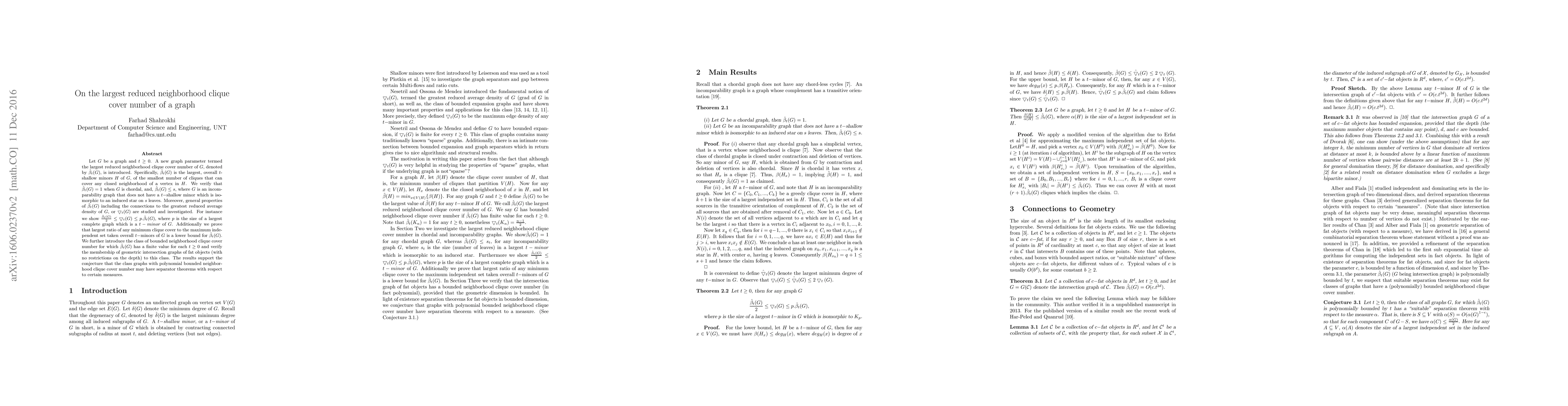 Let $G$ be a graph and $t\ge 0$. A new graph parameter termed the largest reduced neighborhood clique cover number of $G$, denoted by ${\hat\beta}_t(G)$, is introduced. Specifically, ${\hat\beta}_t(G)$ is the largest, overall $t$-shallow minors $H$ of $G$, of the smallest number of cliques that can cover any closed neighborhood of a vertex in $H$. We verify that ${\hat\beta}_t(G)=1$ when $G$ is chordal, and, ${\hat\beta}_t(G)\le s$, where $G$ is an incomparability graph that does not have a $t-$shallow minor which is isomorphic to an induced star on $s$ leaves. Moreover, general properties of ${\hat\beta}_t(G)$ including the connections to the greatest reduced average density of $G$, or $\bigtriangledown_t(G)$ are studied and investigated. For instance we show ${{\hat\beta}_t(G)\over 2}\le \bigtriangledown_t(G)\le p.{\hat\beta}_t(G),$ where $p$ is the size of a largest complete graph which is a $t-minor$ of $G$. Additionally we prove that largest ratio of any minimum clique cover to the maximum independent set taken overall $t-$minors of $G$ is a lower bound for ${\hat\beta}_t(G)$. We further introduce the class of bounded neighborhood clique cover number for which ${\hat\beta}_t(G)$ has a finite value for each $t\ge 0$ and verify the membership of geometric intersection graphs of fat objects (with no restrictions on the depth) to this class. The results support the conjecture that the class graphs with polynomial bounded neighborhood clique cover number may have separator theorems with respect to certain measures.