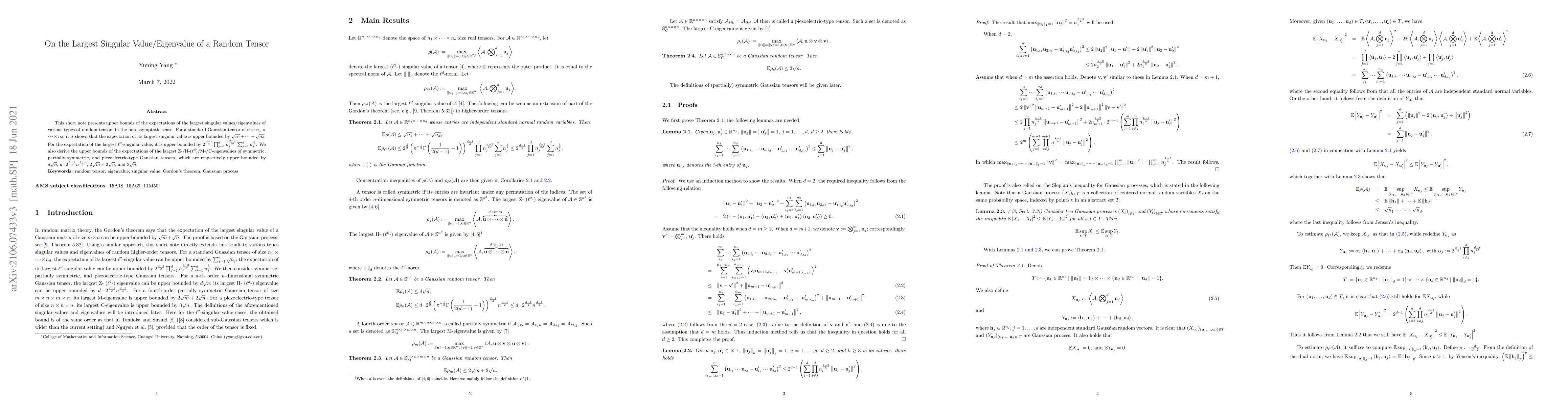 This paper provides upper bounds for the expectations of the largest singular values and eigenvalues of various random tensors, including Gaussian tensors and specific types like Z-/H-($\ell^d$)/M-/C-eigenvalues. The largest singular value of a Gaussian tensor is upper bounded by the sum of its dimensions' square roots.