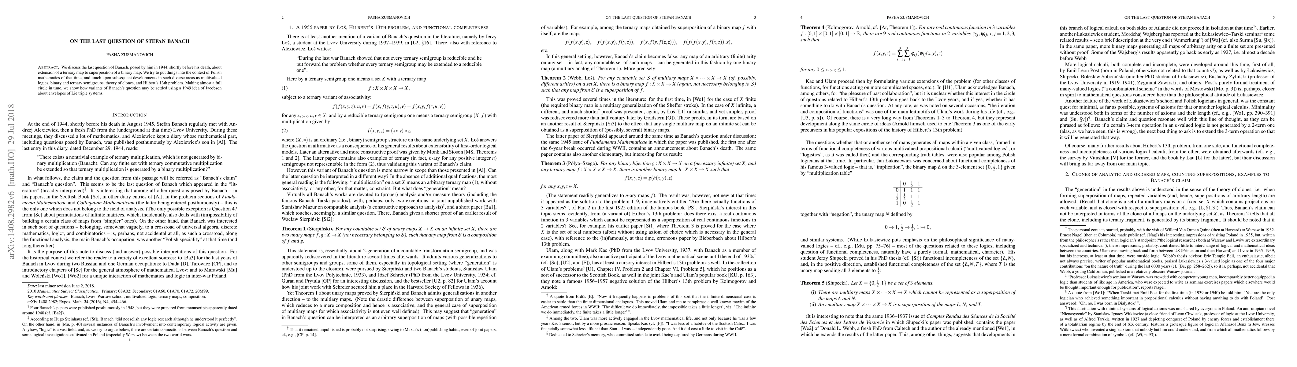 We discuss the last question of Banach, posed by him in 1944, shortly before his death, about extension of a ternary map to superposition of a binary map. We try to put things into the context of Polish mathematics of that time, and touch upon subsequent developments in such diverse areas as multivalued logics, binary and ternary semigroups, theory of clones, and Hilbert's 13th problem. Making almost a full circle in time, we show how variants of Banach's question may be settled using a 1949 idea of Jacobson about envelopes of Lie triple systems.