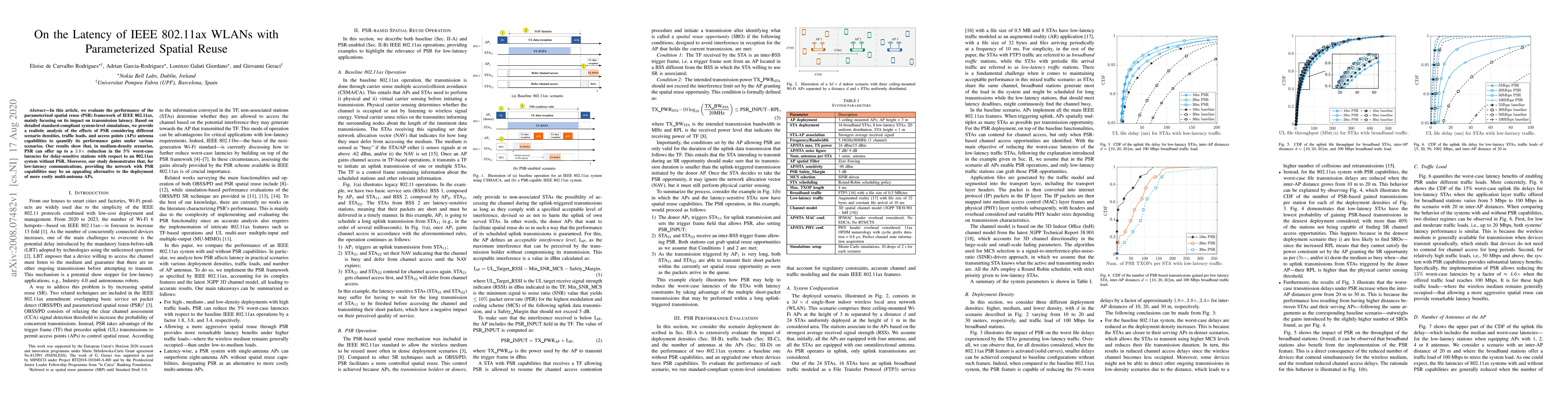 This paper evaluates the impact of parameterized spatial reuse (PSR) in IEEE 802.11ax WLANs on transmission latency through system-level simulations. Results indicate that PSR can reduce the 5% worst-case latencies by up to 3.8x in medium-density scenarios, suggesting it as a cost-effective alternative to multi-antenna access points for low-latency communications.