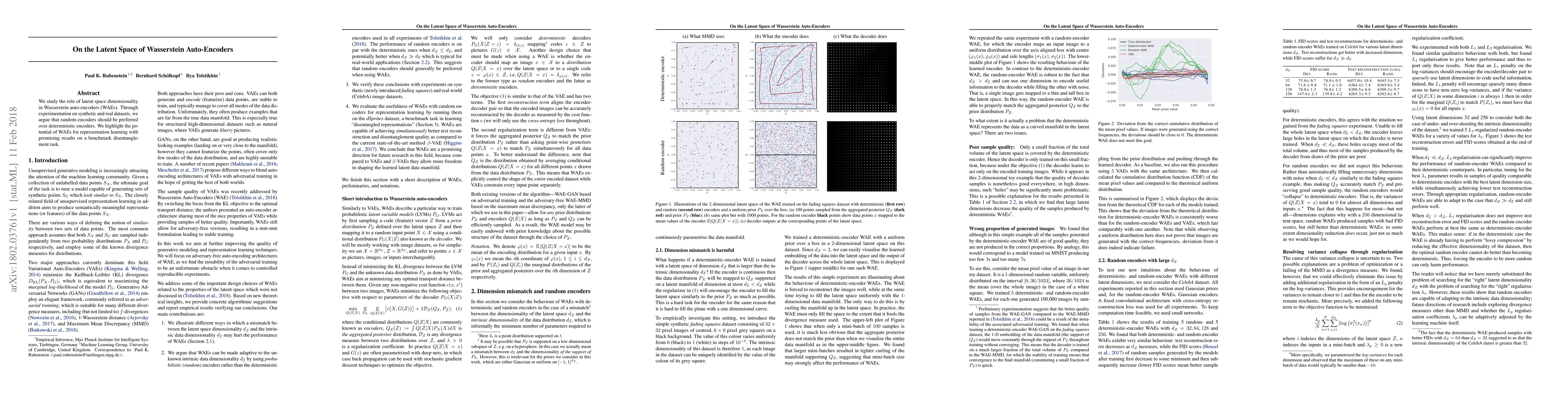 We study the role of latent space dimensionality in Wasserstein auto-encoders (WAEs). Through experimentation on synthetic and real datasets, we argue that random encoders should be preferred over deterministic encoders. We highlight the potential of WAEs for representation learning with promising results on a benchmark disentanglement task.