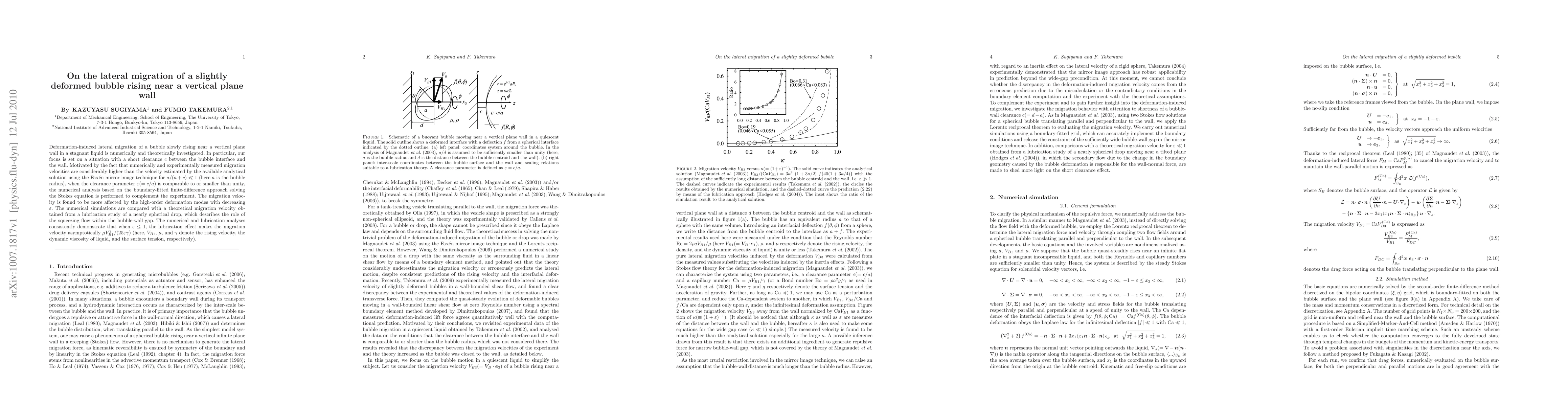 This paper investigates the lateral migration of a slightly deformed bubble rising close to a vertical plane wall using numerical and theoretical methods. The study finds that the migration velocity is significantly influenced by high-order deformation modes, especially when the clearance parameter is comparable to or smaller than unity, and is better described by lubrication effects than by existing analytical solutions.