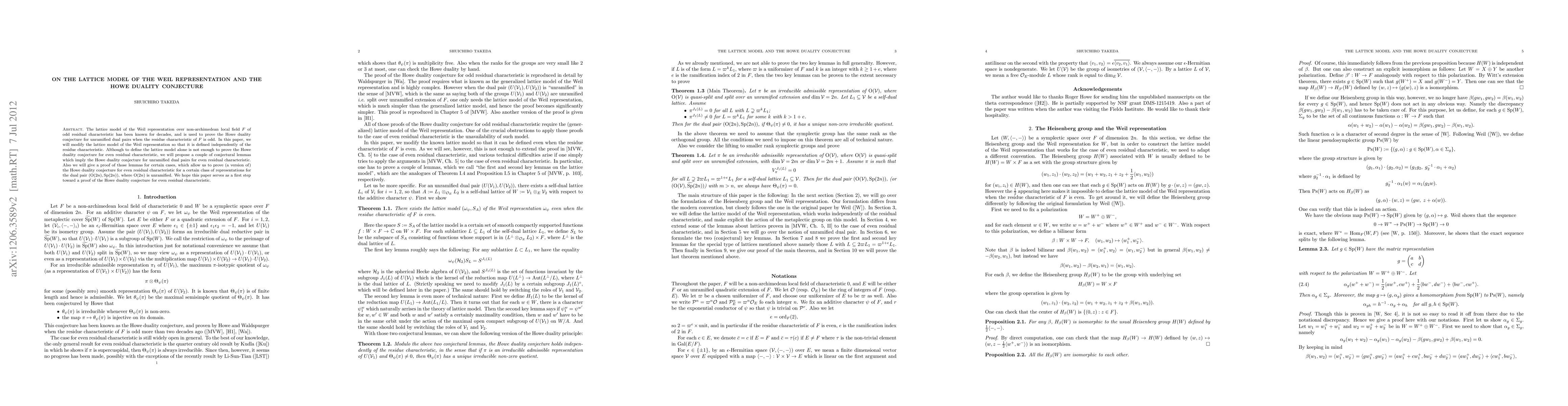 This paper modifies the lattice model of the Weil representation to apply independently of the residue characteristic, proposing conjectural lemmas that support the Howe duality conjecture for even residual characteristics, and providing partial proofs for these conjectures applied to the dual pair $(\mathrm{O}(2n), \mathrm{Sp}(2n))$.