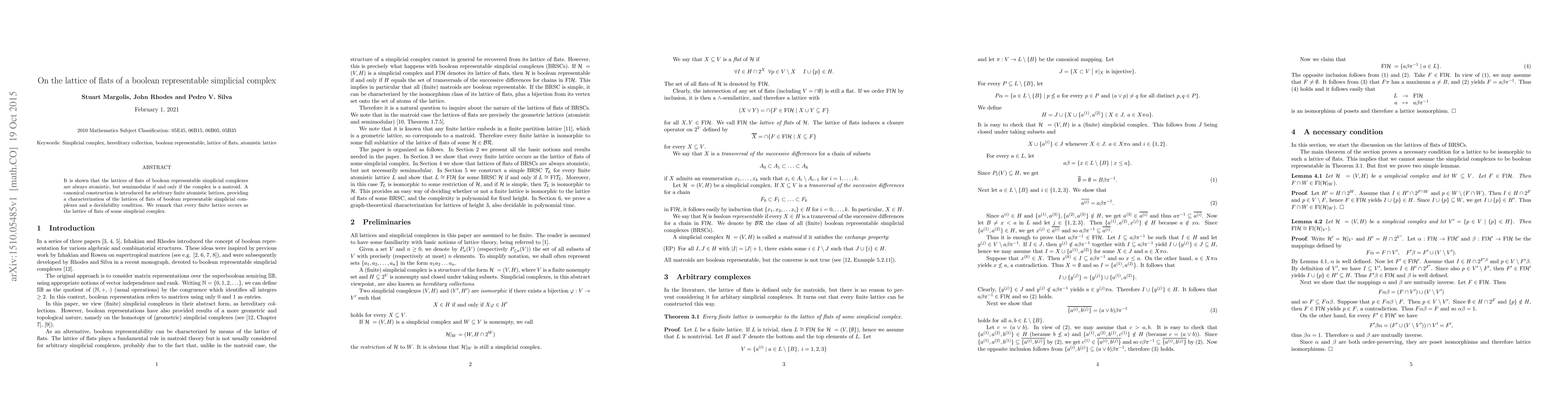 This paper demonstrates that the lattices of flats in boolean representable simplicial complexes are always atomistic and semimodular if and only if the complex is a matroid. It introduces a canonical construction for finite atomistic lattices, characterizing these lattices and providing a decidability condition.