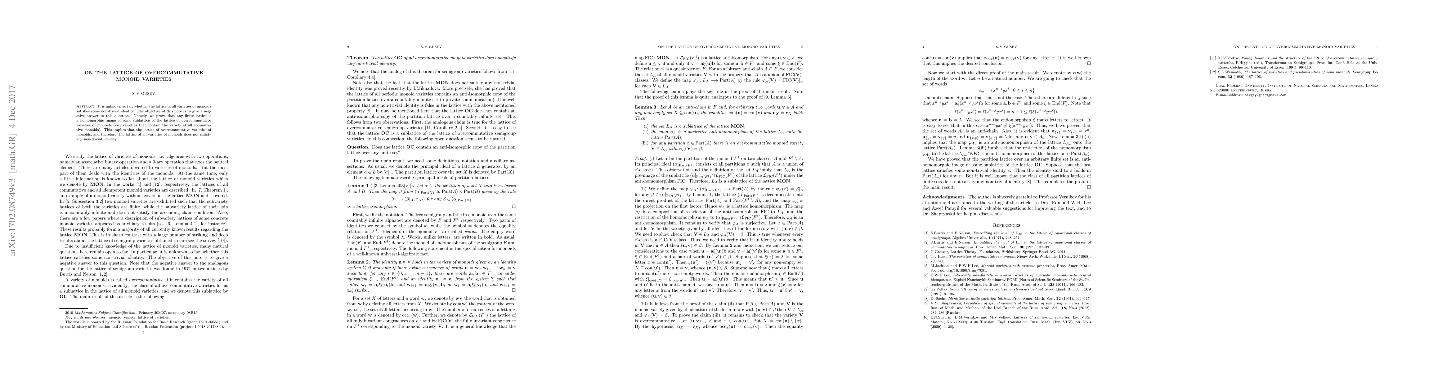 This paper proves that any finite lattice is a homomorphic image of a sublattice within the lattice of overcommutative varieties of monoids, thereby demonstrating that neither this sublattice nor the entire lattice of all monoid varieties satisfies any non-trivial identity.
