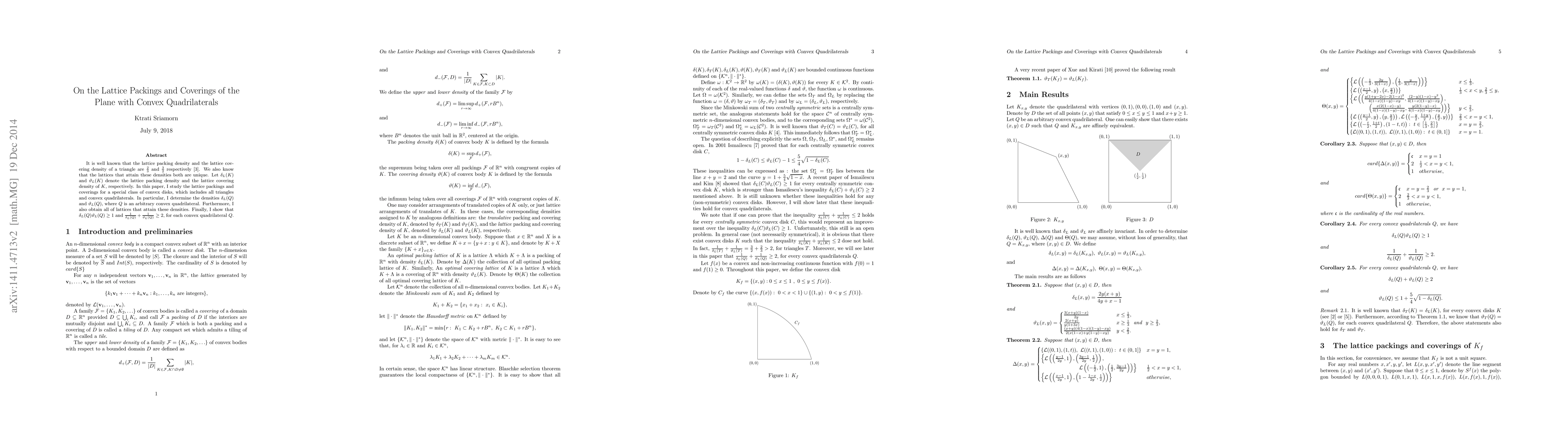 This paper investigates lattice packings and coverings of the plane with convex quadrilaterals, determining their densities and identifying lattices that attain these densities, while also showing certain inequalities related to these properties.