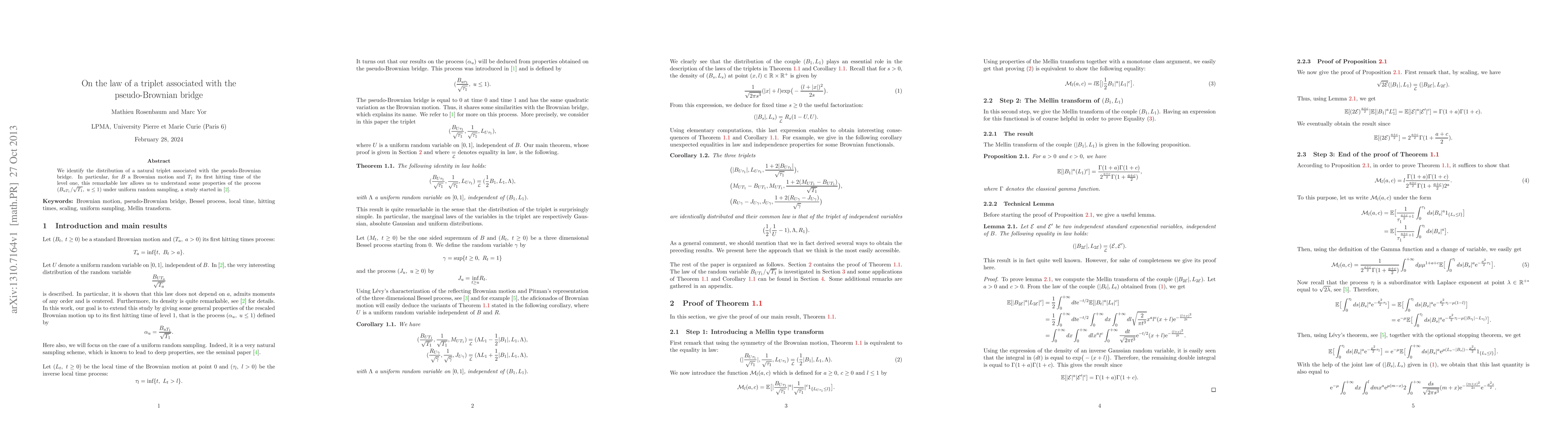 This paper identifies the distribution of a triplet linked to the pseudo-Brownian bridge, revealing properties of the scaled Brownian motion process under uniform random sampling. The findings provide insights into the behavior of the process $(B_{uT_1}/\sqrt{T_1}, u\leq 1)$ where $T_1$ is the first hitting time of level one.
