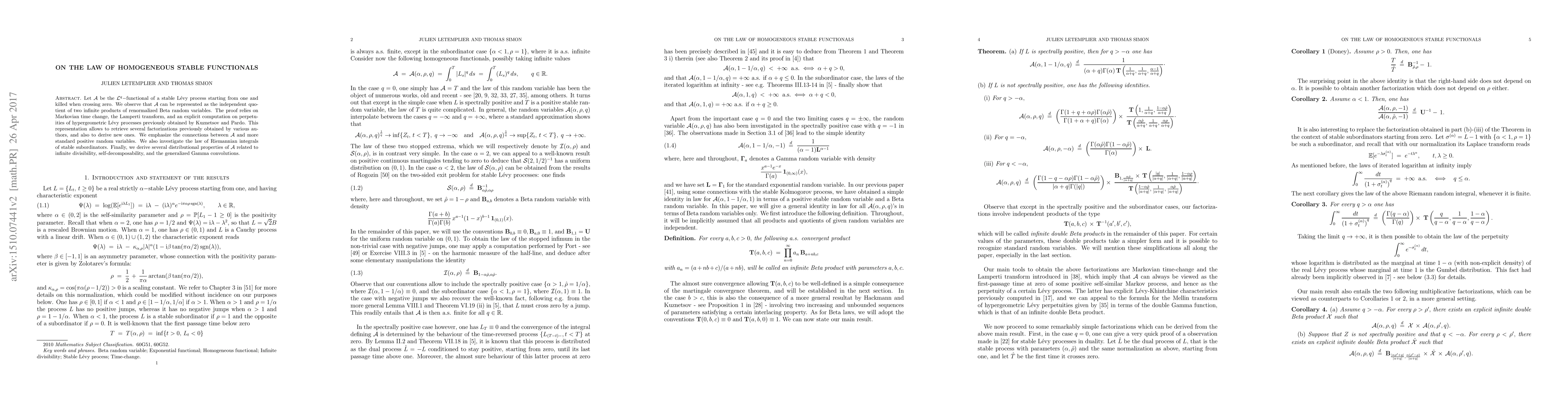 Let ${\mathcal A}$ be the ${\mathcal L}^q-$functional of a stable L\'evy process starting from one and killed when crossing zero. We observe that ${\mathcal A}$ can be represented as the independent quotient of two infinite products of renormalized Beta random variables. The proof relies on Markovian time change, the Lamperti transform, and an explicit computation on perpetuities of hypergeometric L\'evy processes previously obtained by Kuznetsov and Pardo. This representation allows to retrieve several factorizations previously obtained by various authors, and also to derive new ones. We emphasize the connections between ${\mathcal A}$ and more standard positive random variables. We also investigate the law of Riemannian integrals of stable subordinators. Finally, we derive several distributional properties of ${\mathcal A}$ related to infinite divisibility, self-decomposability, and the generalized Gamma convolutions.
