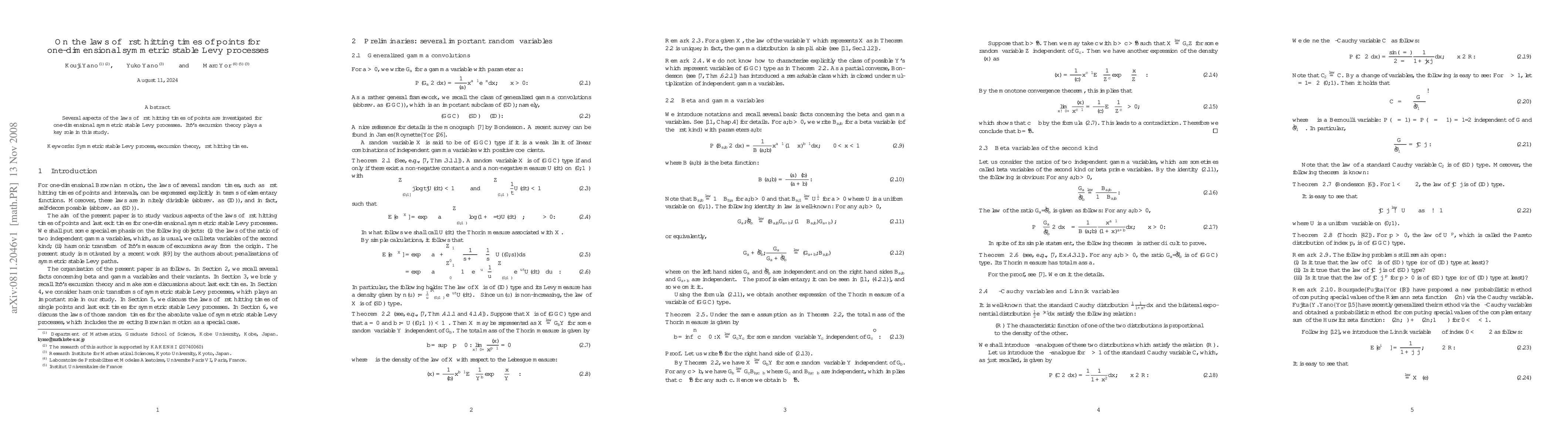 Summary: This paper investigates the laws of first hitting times for points in one-dimensional symmetric stable Lévy processes, utilizing Itô's excursion theory to analyze these probabilistic behaviors.