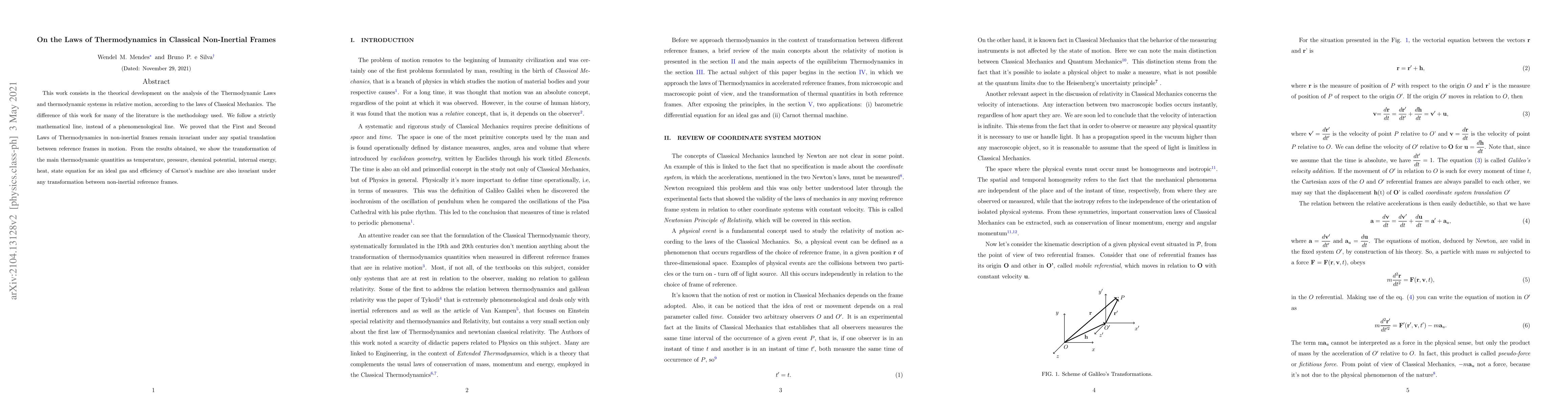 This work consists in the theorical development on the analysis of the Thermodynamic Laws and thermodynamic systems in relative motion, according to the laws of Classical Mechanics. The difference of this work for many of the literature is the methodology used. We follow a strictly mathematical line, instead of a phenomenological line. We proved that the First and Second Laws of Thermodynamics in non-inertial frames remain invariant under any spatial translation between reference frames in motion. From the results obtained, we show the transformation of the main thermodynamic quantities as temperature, pressure, chemical potential, internal energy, heat, state equation for an ideal gas and efficiency of Carnot's machine are also invariant under any transformation between non-inertial reference frames.