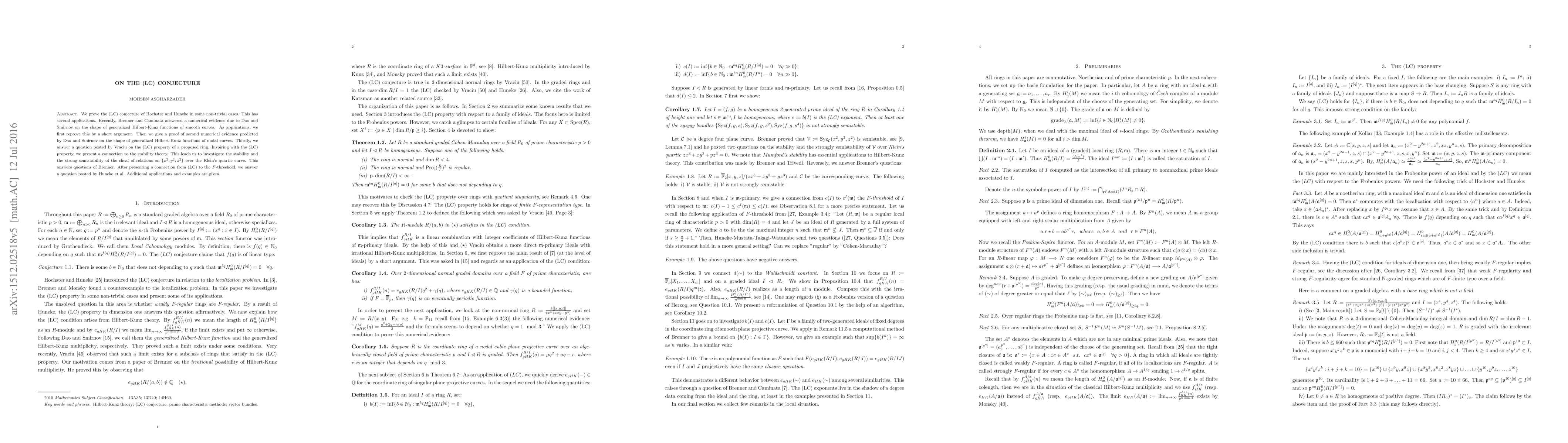 This paper proves the (LC) conjecture in specific cases, providing applications to generalized Hilbert-Kunz functions and addressing questions on the (LC) property of certain rings. It also explores connections to stability theory and the $F$-threshold, offering further insights into related mathematical structures.