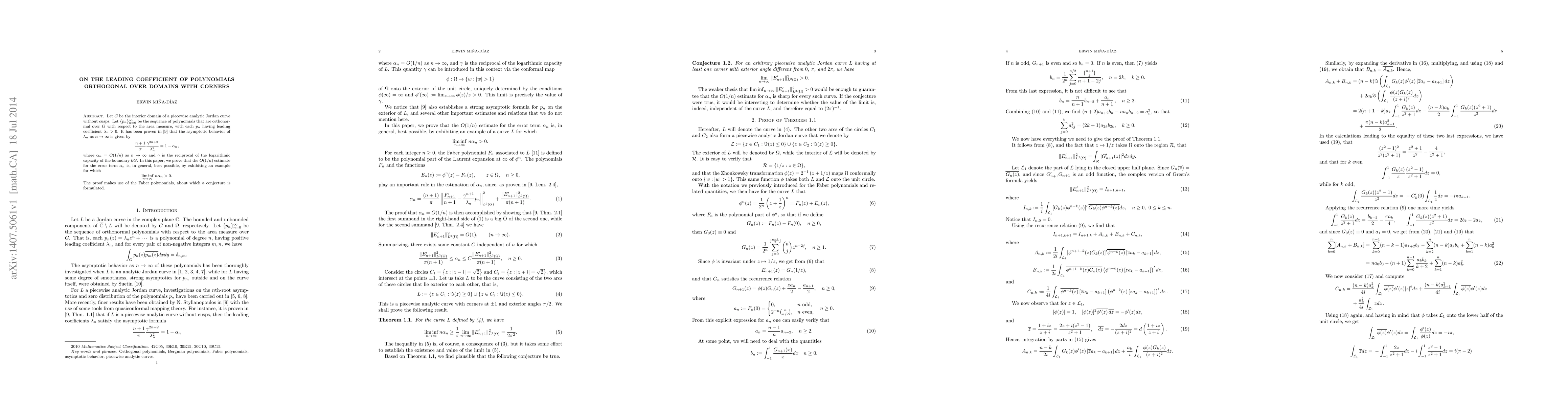 This paper investigates the leading coefficient $\lambda_n$ of orthonormal polynomials over domains with corners, proving that the $O(1/n)$ error term in the asymptotic behavior is optimal. The proof utilizes Faber polynomials and suggests a related conjecture.