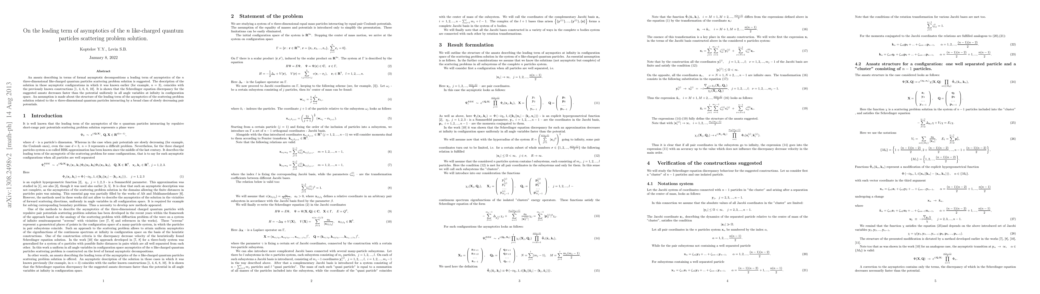 This paper proposes an ansatz for the leading term in the asymptotic solution of the scattering problem for n three-dimensional like-charged quantum particles. The ansatz aligns with known configurations for n=3 and demonstrates a faster decrease in Schrödinger equation discrepancy at infinity compared to potentials. The study assumes a leading term structure for n three-dimensional quantum particles interacting via a wide range of slowly decreasing pair potentials.