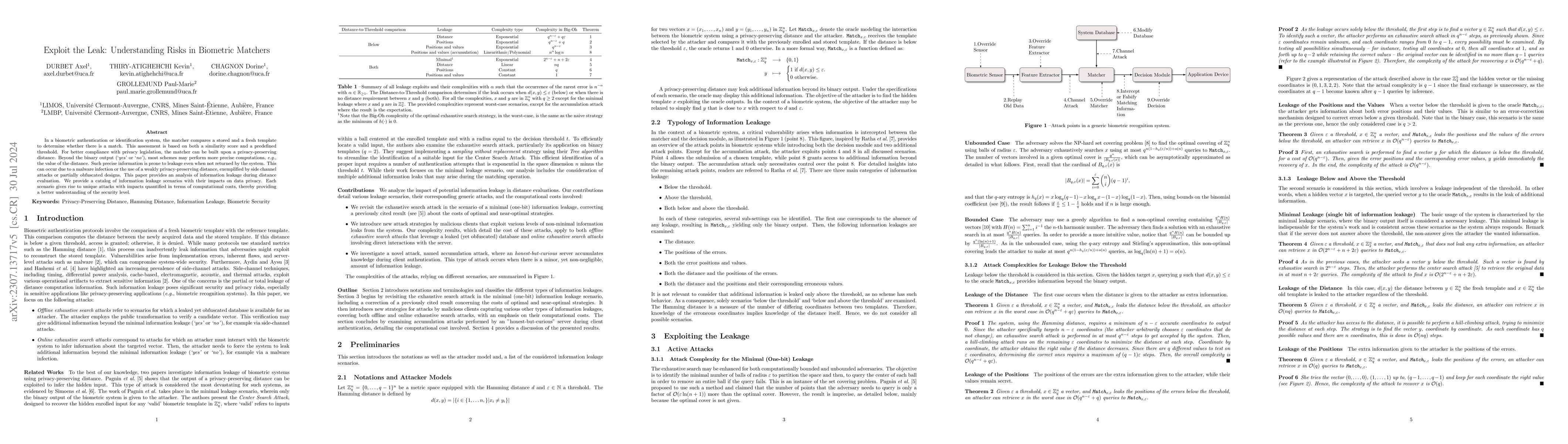 This paper analyzes how precise computations performed by biometric matcher algorithms, even when obfuscated, can leak sensitive information, potentially through side channel attacks. It categorizes leakage scenarios and quantifies their impact on privacy in terms of computational costs to assess security levels.
