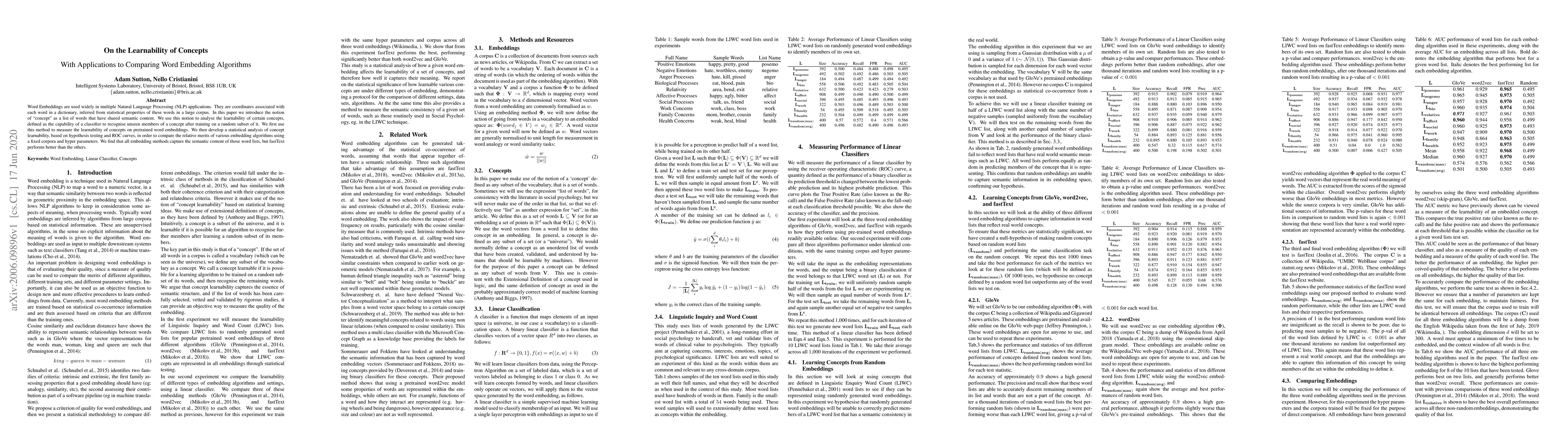 Word Embeddings are used widely in multiple Natural Language Processing (NLP) applications. They are coordinates associated with each word in a dictionary, inferred from statistical properties of these words in a large corpus. In this paper we introduce the notion of "concept" as a list of words that have shared semantic content. We use this notion to analyse the learnability of certain concepts, defined as the capability of a classifier to recognise unseen members of a concept after training on a random subset of it. We first use this method to measure the learnability of concepts on pretrained word embeddings. We then develop a statistical analysis of concept learnability, based on hypothesis testing and ROC curves, in order to compare the relative merits of various embedding algorithms using a fixed corpora and hyper parameters. We find that all embedding methods capture the semantic content of those word lists, but fastText performs better than the others.
