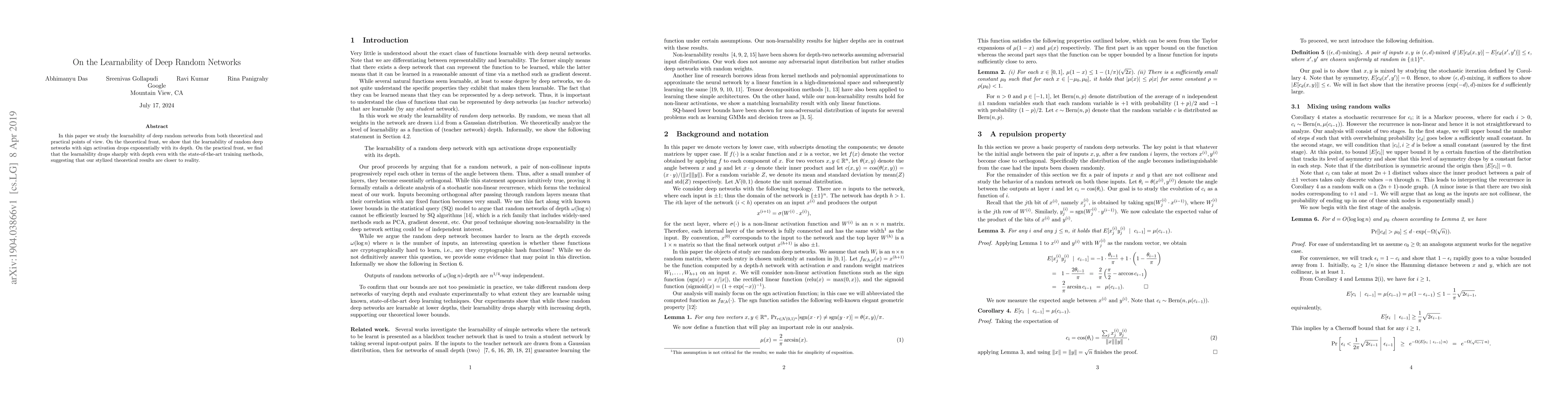 This paper investigates the learnability of deep random networks, demonstrating theoretically that learnability decreases exponentially with depth for networks with sign activation. Empirically, the study finds similar sharp declines in learnability with depth, even using advanced training methods, aligning theoretical results with practical observations.