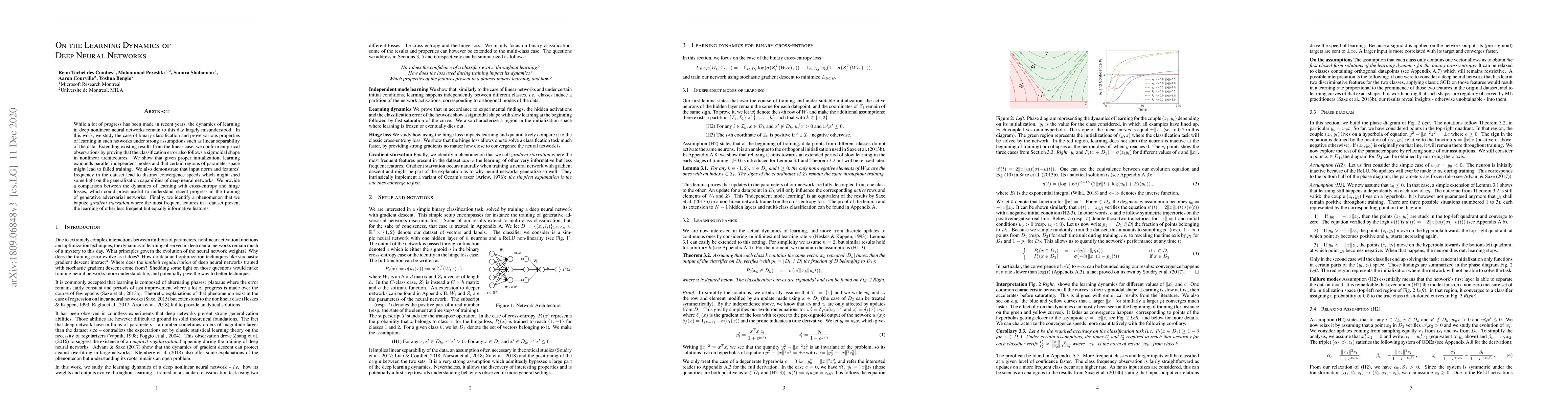 While a lot of progress has been made in recent years, the dynamics of learning in deep nonlinear neural networks remain to this day largely misunderstood. In this work, we study the case of binary classification and prove various properties of learning in such networks under strong assumptions such as linear separability of the data. Extending existing results from the linear case, we confirm empirical observations by proving that the classification error also follows a sigmoidal shape in nonlinear architectures. We show that given proper initialization, learning expounds parallel independent modes and that certain regions of parameter space might lead to failed training. We also demonstrate that input norm and features' frequency in the dataset lead to distinct convergence speeds which might shed some light on the generalization capabilities of deep neural networks. We provide a comparison between the dynamics of learning with cross-entropy and hinge losses, which could prove useful to understand recent progress in the training of generative adversarial networks. Finally, we identify a phenomenon that we baptize gradient starvation where the most frequent features in a dataset prevent the learning of other less frequent but equally informative features.