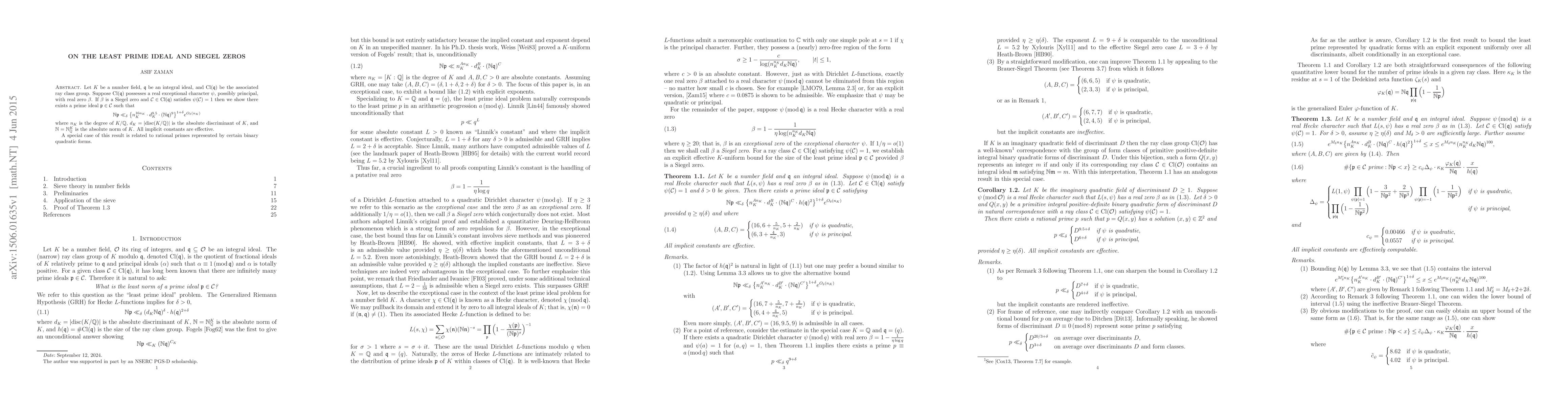This paper establishes an effective $K$-uniform Linnik-type bound for the least norm of a prime ideal in a ray class group associated with an integral ideal, under the presence of a Siegel zero in the exceptional character. The result is particularly relevant for rational primes represented by specific binary quadratic forms.