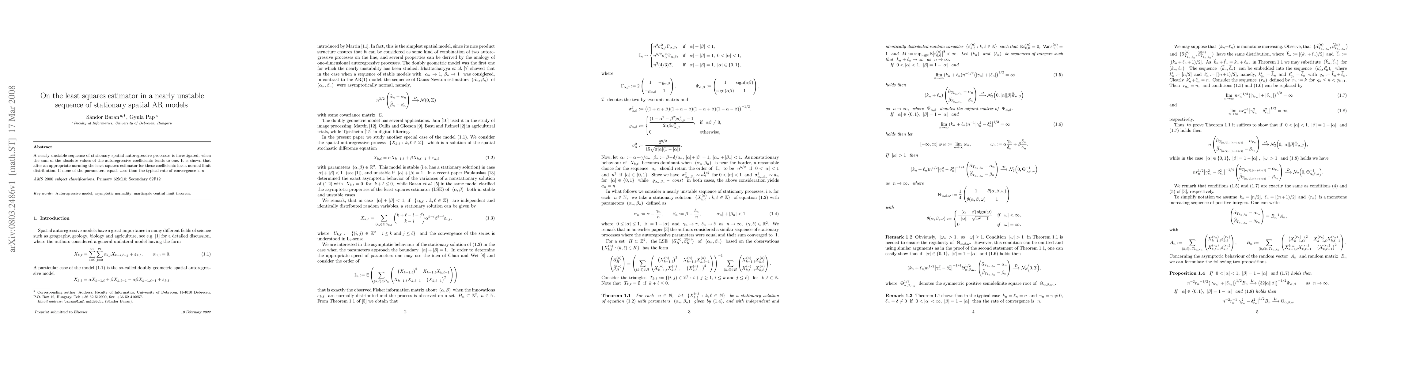 Summary: This paper examines nearly unstable spatial autoregressive models where the sum of autoregressive coefficients approaches one. It demonstrates that the least squares estimator for these coefficients, under proper normalization, converges to a normal distribution, with a typical convergence rate of n.
