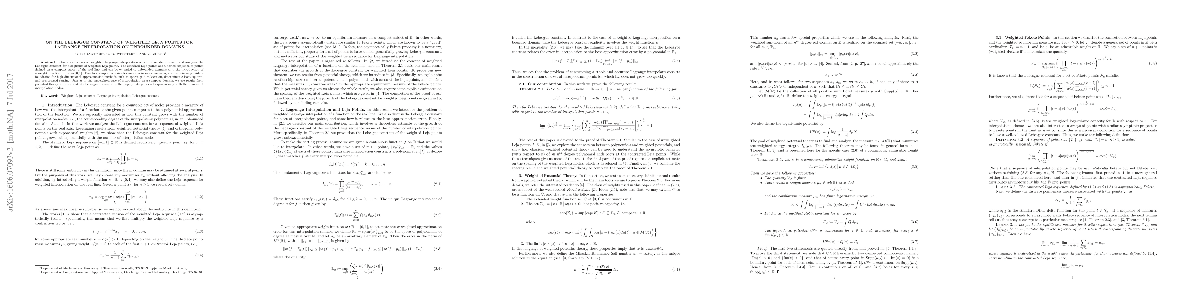 This work focuses on weighted Lagrange interpolation on an unbounded domain, and analyzes the Lebesgue constant for a sequence of weighted Leja points. The standard Leja points are a nested sequence of points defined on a compact subset of the real line, and can be extended to unbounded domains with the introduction of a weight function $w:\mathbb{R}\rightarrow [0,1]$. Due to a simple recursive formulation in one dimension, such abscissas provide a foundation for high-dimensional approximation methods such as sparse grid collocation, deterministic least squares, and compressed sensing. Just as in the unweighted case of interpolation on a compact domain, we use results from potential theory to prove that the Lebesgue constant for the Leja points grows subexponentially with the number of interpolation nodes.