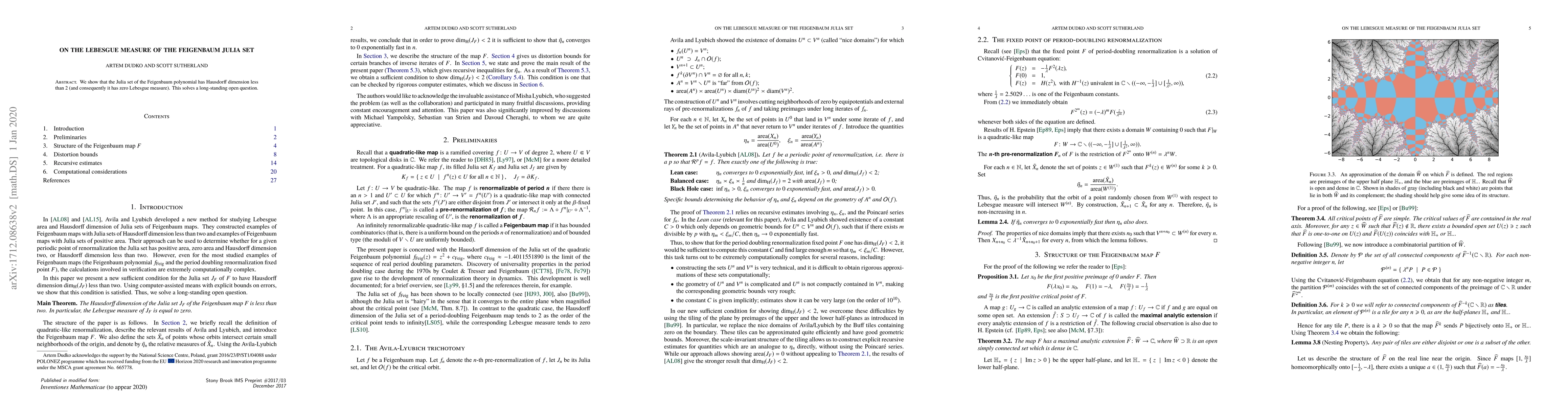 Summary: The paper demonstrates that the Hausdorff dimension of the Feigenbaum Julia set is less than 2, leading to its Lebesgue measure being zero, thereby resolving a longstanding question.
