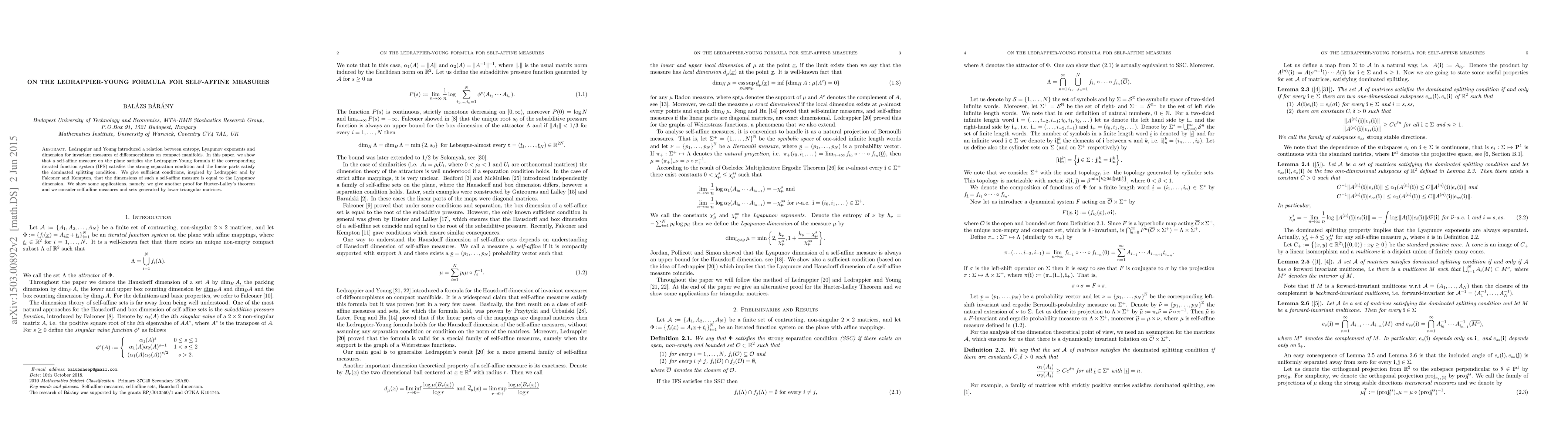 This paper demonstrates that self-affine measures on the plane satisfy the Ledrappier-Young formula under specific conditions, such as strong separation and dominated splitting. It provides sufficient conditions for the dimensions of these measures to match the Lyapunov dimension and applies these findings to prove Hueter-Lalley's theorem.