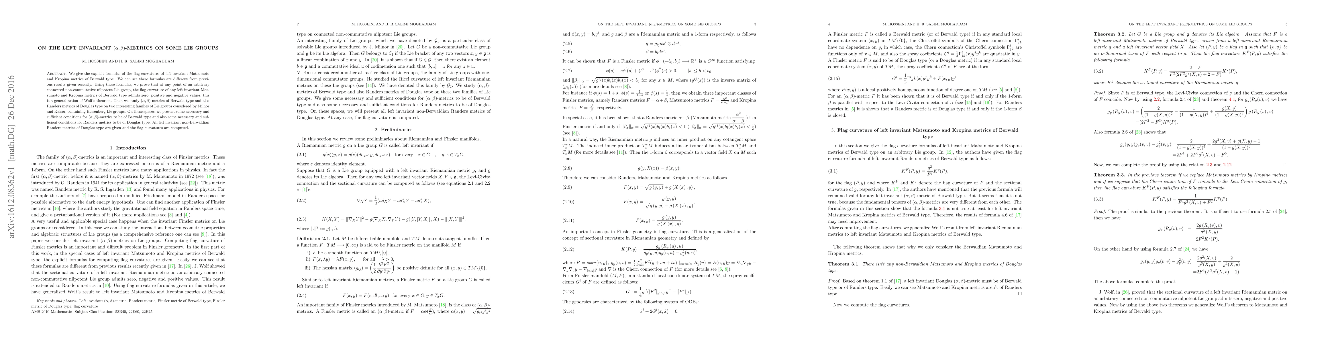 This paper presents explicit formulas for the flag curvatures of left invariant Matsumoto and Kropina metrics on arbitrary connected non-commutative nilpotent Lie groups, demonstrating that these curvatures can be zero, positive, or negative, thus generalizing Wolf's theorem. It also explores $(\alpha,\beta)$-metrics and Randers metrics on specific Lie groups, providing conditions for them to be of Berwald and Douglas types respectively.