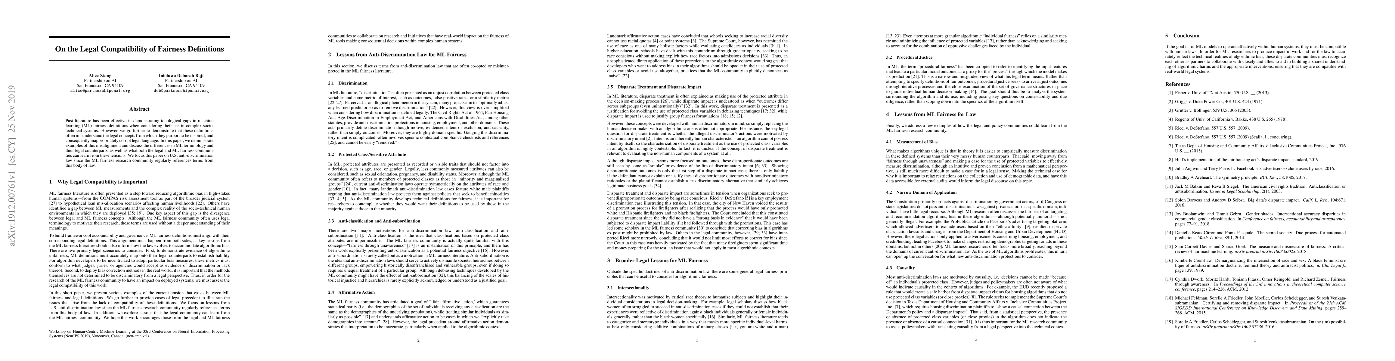This paper examines the misalignment between machine learning fairness definitions and U.S. anti-discrimination law, highlighting how ML concepts often misinterpret legal terms. It discusses the implications for both the legal and ML fairness communities and suggests ways to bridge these differences.