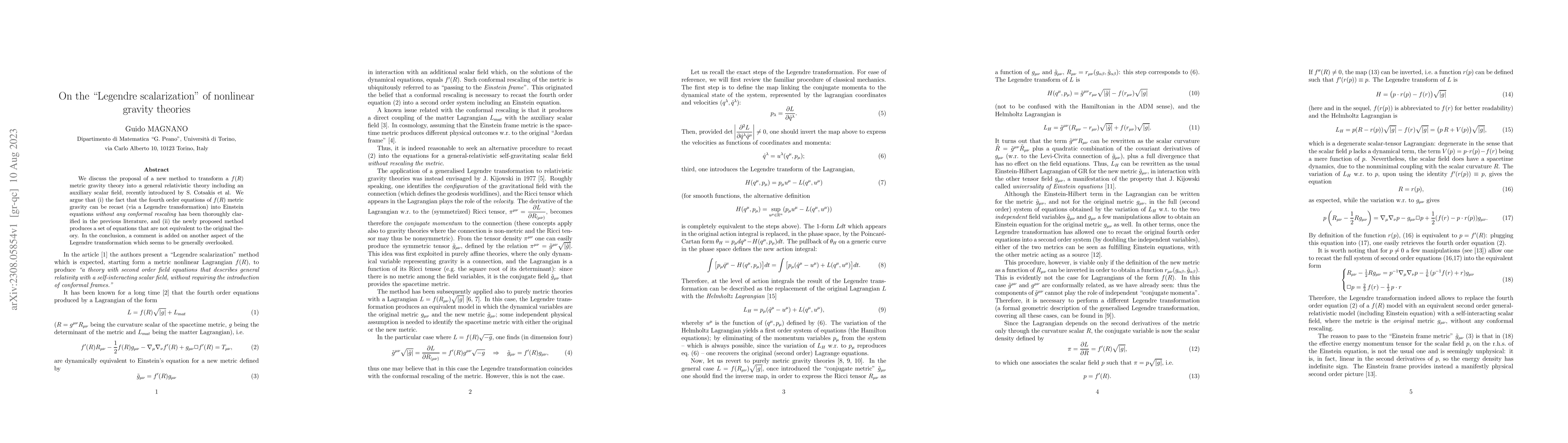 This paper critiques the "Legendre scalarization" method proposed by S. Cotsakis et al. for transforming f(R) metric gravity into a general relativistic theory, arguing that it does not produce equivalent equations to the original theory. It also highlights an overlooked aspect of the Legendre transformation.