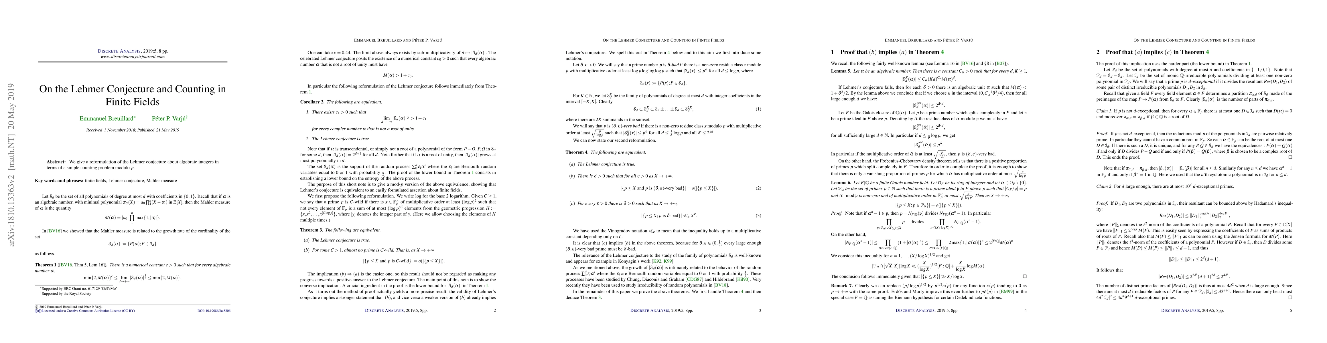 We give a reformulation of the Lehmer conjecture about algebraic integers in terms of a simple counting problem modulo p.