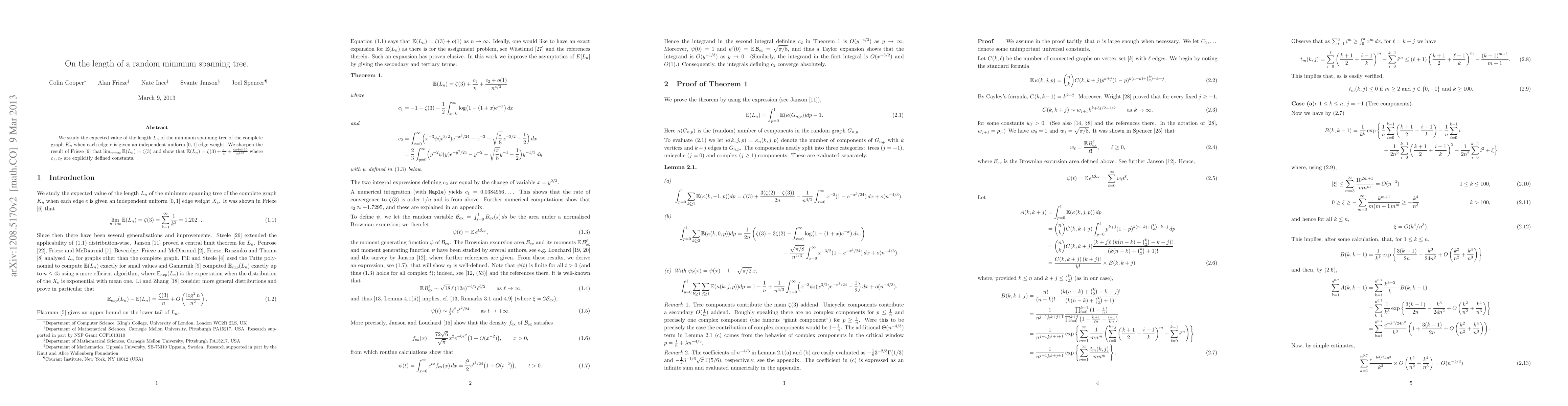 This paper refines the asymptotic behavior of the expected length of a random minimum spanning tree in a complete graph with uniform edge weights, providing a more precise expression that includes additional terms dependent on $n$ and constants $c_1$ and $c_2$. The result extends previous findings by Frieze.