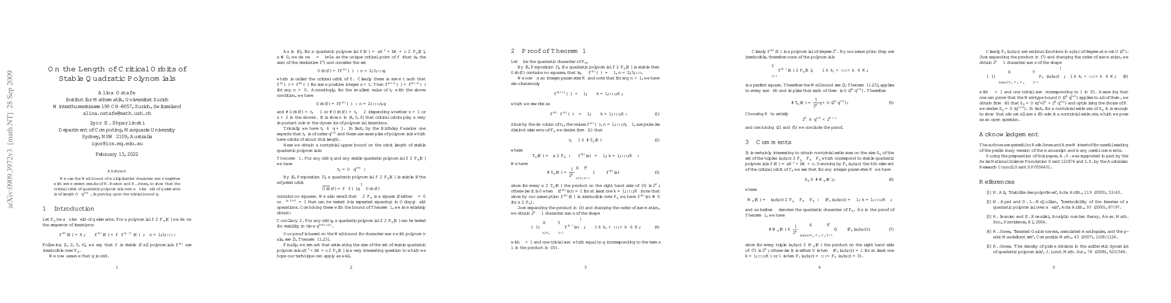 We use the Weil bound of multiplicative character sums together with some recent results of N. Boston and R. Jones, to show that the critical orbit of quadratic polynomials over a finite field of $q$ elements is of length $O(q^{3/4})$, improving upon the trivial bound $q$.