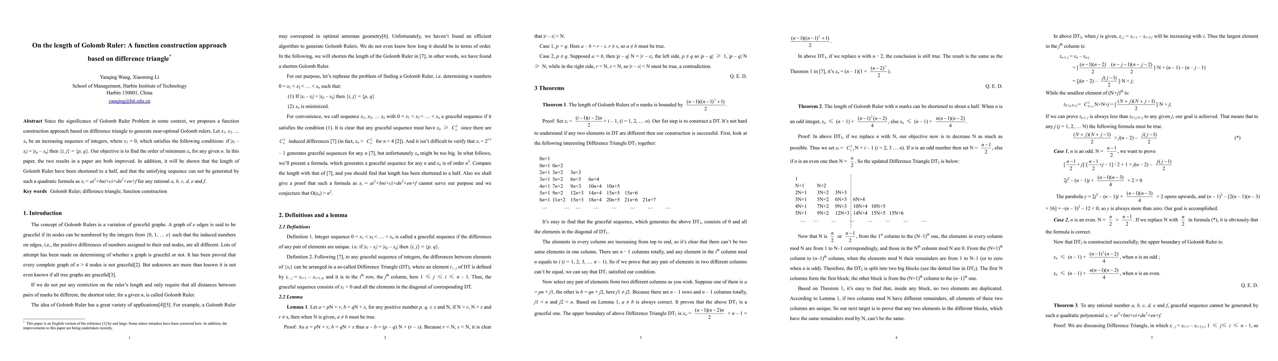 Since the significance of Golomb Ruler Problem in some context, we proposes a function construction approach based on difference triangle to generate near-optimal Golomb rulers. Let x1, x2, ..., xn be an increasing sequence of integers, where x1 = 0, which satisfies the following conditions: if abs(xi-xj) = abs(xp-xq) then {i, j} = {p,q}. Our objective is to find the order of minimum xn for any given n. In this paper, the two results in a paper are both improved. In addition, it will be shown that the length of Golomb Ruler have been shortened to a half, and that the satisfying sequence can not be generated by such a quadratic formula as $xi = ai^2+bni+ci+dn^2+en+f$ for any rational a, b, c, d, e and f.