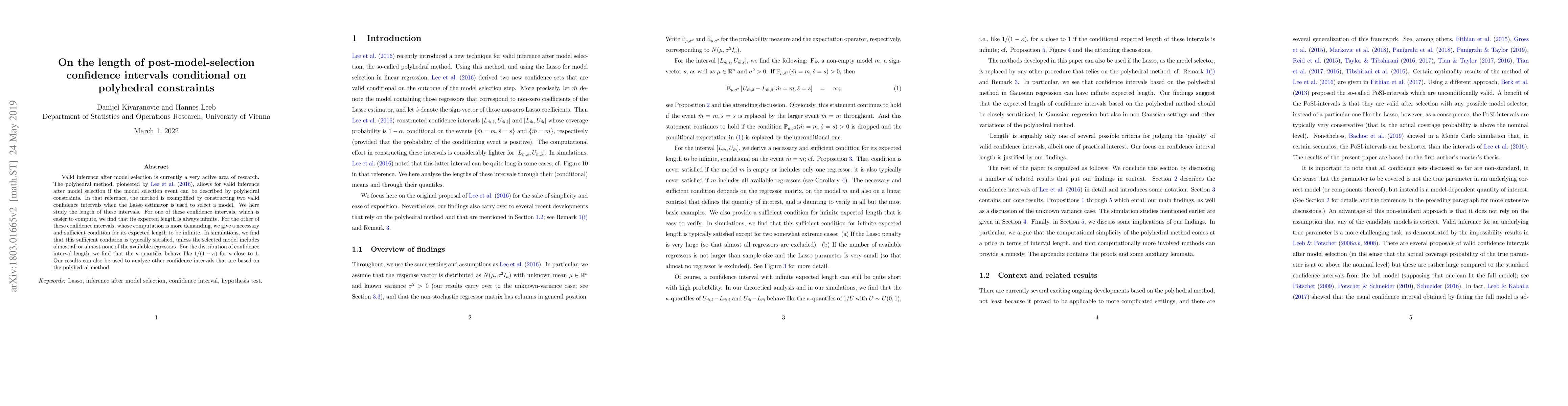 This paper investigates the length of post-model-selection confidence intervals under polyhedral constraints, finding that one interval's expected length is always infinite. It provides a condition for the other interval's expected length to be infinite, which is typically met in simulations unless nearly all or none of the regressors are selected.