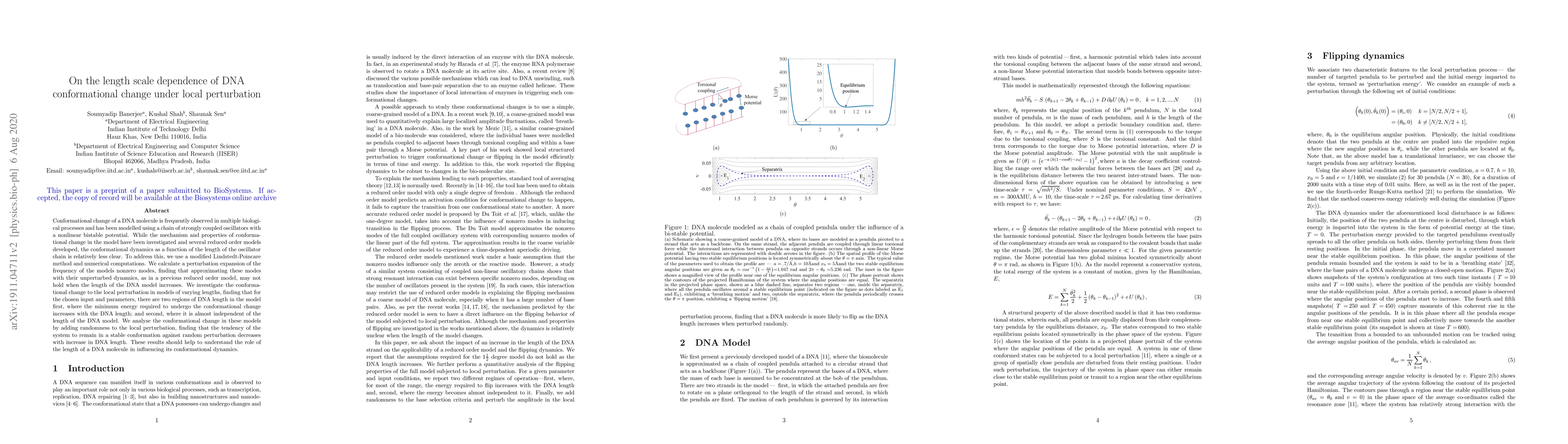 Conformational change of a DNA molecule is frequently observed in multiple biological processes and has been modelled using a chain of strongly coupled oscillators with a nonlinear bistable potential. While the mechanism and properties of conformational change in the model have been investigated and several reduced order models developed, the conformational dynamics as a function of the length of the oscillator chain is relatively less clear. To address this, we used a modified Lindstedt-Poincare method and numerical computations. We calculate a perturbation expansion of the frequency of the model's nonzero modes, finding that approximating these modes with their unperturbed dynamics, as in a previous reduced order model, may not hold when the length of the DNA model increases. We investigate the conformational change to local perturbation in models of varying lengths, finding that for chosen input and parameters, there are two regions of DNA length in the model, first where the minimum energy required to undergo the conformational change increases with DNA length; and second, where it is almost independent of the length of the DNA model. We analyze the conformational change in these models by adding randomness to the local perturbation, finding that the tendency of the system to remain in a stable conformation against random perturbation decreases with an increase in the DNA length. These results should help to understand the role of the length of a DNA molecule in influencing its conformational dynamics.