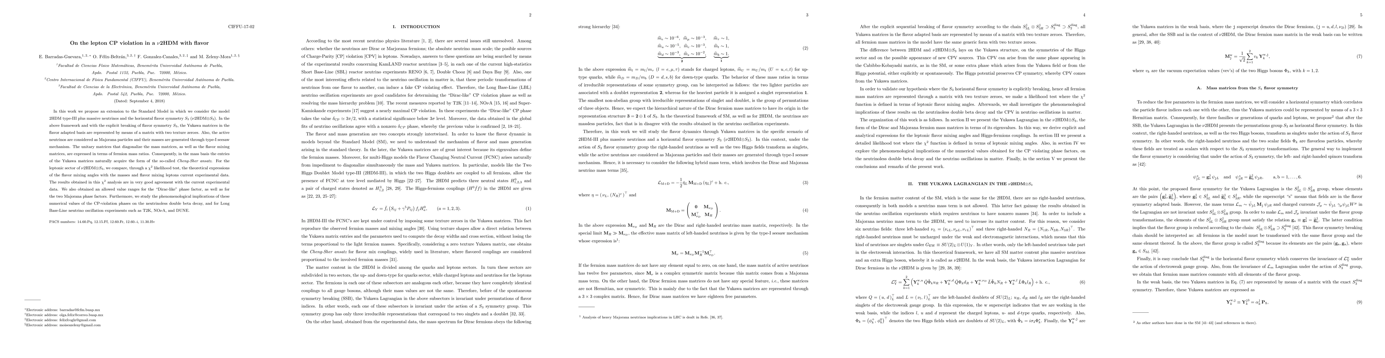 This paper proposes an extension of the Standard Model incorporating a 2HDM type-III with massive neutrinos and a flavor symmetry $S_3$ ($\nu$2HDM$\otimes S_3$). It analyzes lepton CP violation within this framework, finding good agreement with experimental data and determining ranges for CP-violation phase factors, with implications for neutrinoless double beta decay and long-baseline neutrino experiments.