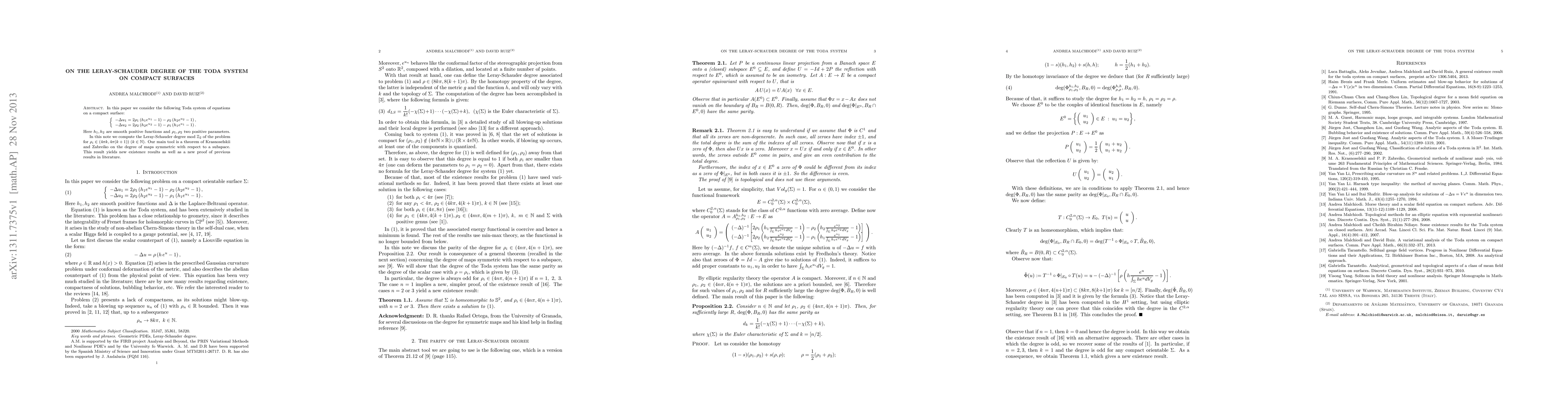 In this paper we consider the so-called Toda system of equations on a compact surface. In particular, we discuss the parity of the Leray-Schauder degree of that problem. Our main tool is a theorem of Krasnoselskii and Zabreiko on the degree of maps symmetric with respect to a subspace. This result yields new existence results as well as a new proof of previous results in literature.
