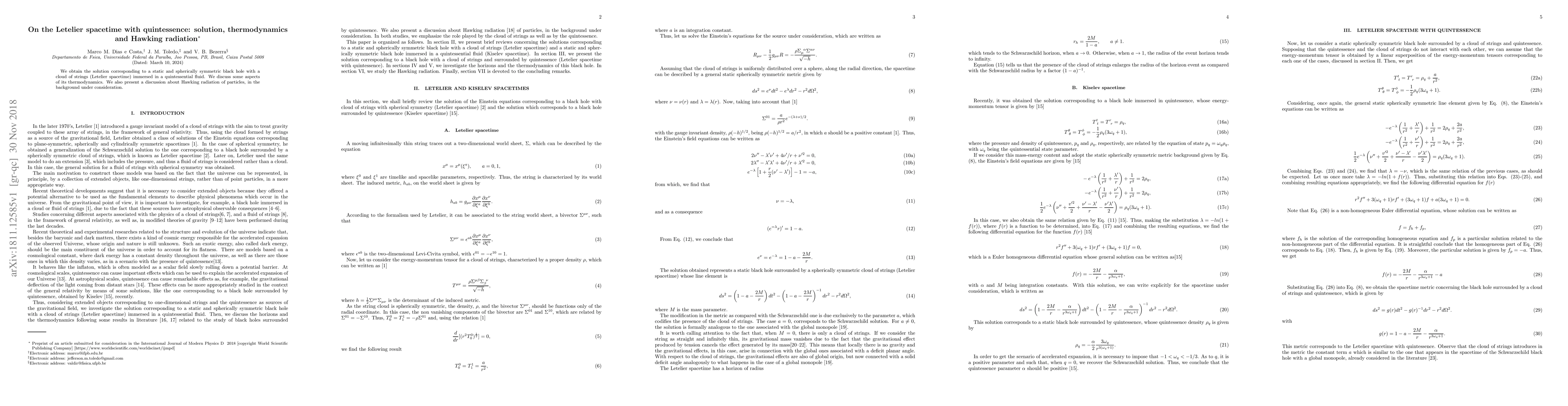 We obtain the solution corresponding to a static and spherically symmetric black hole with a cloud of strings (Letelier spacetime) immersed in a quintessential fluid. We discuss some aspects of its thermodynamics. We also present a discussion about Hawking radiation of particles, in the background under consideration.