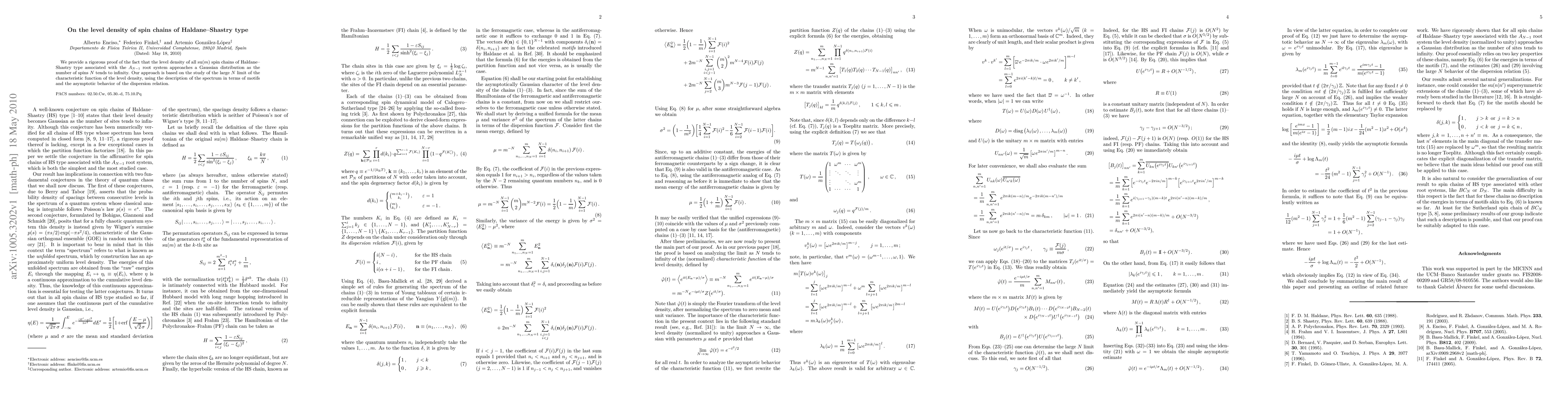 This paper rigorously proves that the level density of su(m) spin chains of Haldane-Shastry type converges to a Gaussian distribution as the number of spins N approaches infinity, utilizing the large N limit of the characteristic function and asymptotic analysis of motifs and dispersion relations.