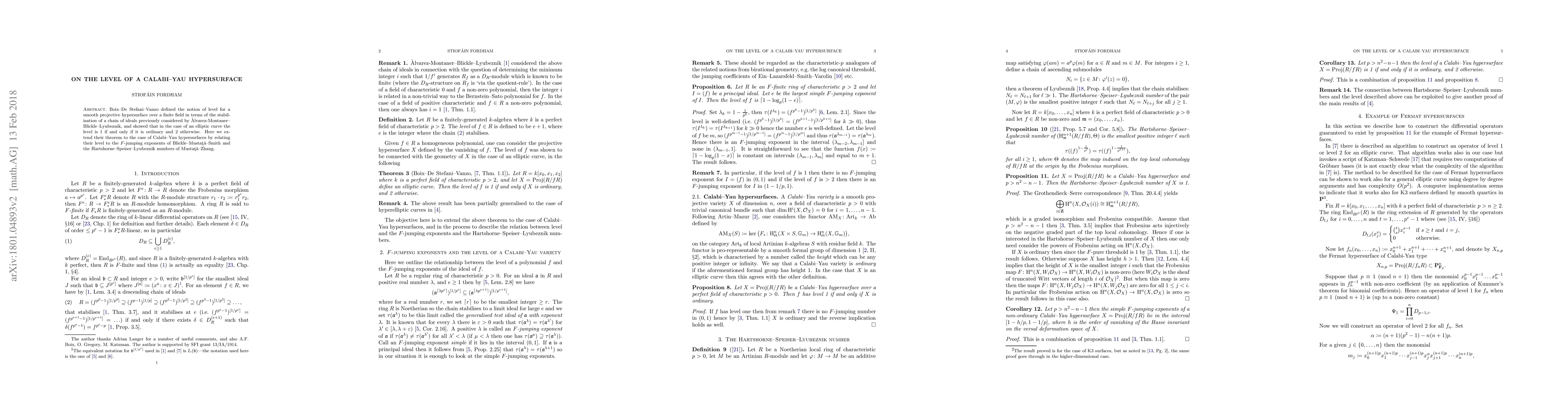 This paper extends the notion of level for smooth projective Calabi-Yau hypersurfaces over a finite field, originally defined for elliptic curves, by linking it to $F$-jumping exponents and Hartshorne-Speiser-Lyubeznik numbers. The authors demonstrate that the level corresponds to specific properties of these hypersurfaces.